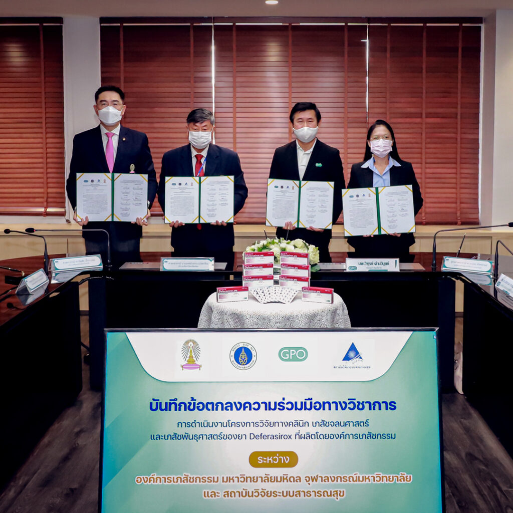นพ.วิฑูรย์ ด่านวิบูลย์ ผู้อำนวยการองค์การเภสัชกรรม ลงนามบันทึกข้อตกลงความร่วมมือทางวิชาการ เรื่องการดำเนินงานโครงการวิจัยทางคลินิก เภสัชจลนศาสตร์ และเภสัชพันธุศาสตร์ของยา Deferasirox กับมหาวิทยาลัยมหิดล โดย ศ.นพ.บรรจง มไหสวริยะ อธิการบดีมหาวิทยาลัยมหิดล จุฬาลงกรณ์มหาวิทยาลัย โดย ศ.ดร.บัณฑิต เอื้ออาภรณ์ อธิการบดีจุฬาลงกรณ์มหาวิทยาลัย และสถาบันวิจัยระบบสาธารณสุข โดย ผศ.ดร.จรวยพร ศรีศศลักษณ์ รองผู้อำนวยการสถาบันวิจัยระบบสาธารณสุข เพื่อศึกษาประสิทธิผล ความปลอดภัย และคุณภาพชีวิตของผู้ป่วยโรคโลหิตจางธาลัสซีเมียที่มีภาวะเหล็กเกินที่ได้รับยา Deferasirox GPO ขององค์การเภสัชกรรม และศึกษาปัจจัยทางพันธุกรรมและปัจจัยทางคลินิกที่มีความสัมพันธ์กับการตอบสนองต่อยา Deferasirox GPO และ/หรือระดับยาในพลาสมา รวมถึงศึกษาเภสัชจลนศาสตร์ของยา Deferasirox GPO และพัฒนาแบบจำลองทางเภสัชจลนศาสตร์เชิงสรีรวิทยา สำหรับทำนายระดับยาในเลือดของผู้ป่วยโรคโลหิตจางธาลัสซีเมียชนิดพึ่งพาเลือดที่มีปัจจัยทางพันธุกรรมและปัจจัยทางคลินิกที่แตกต่างกัน