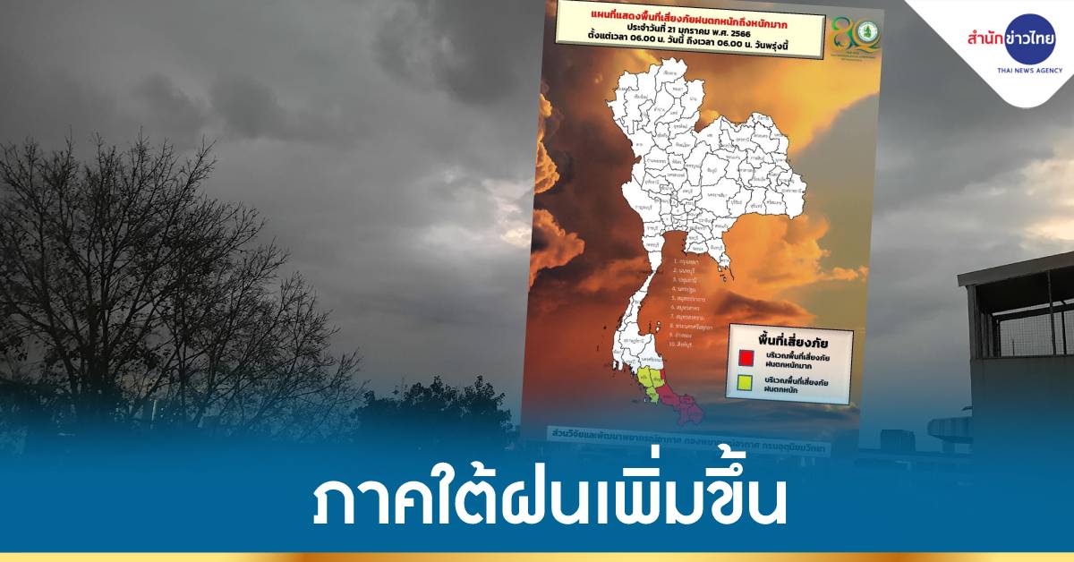 กทม. 21 ม.ค.-กรมอุตุฯ เตือนภาคใต้ฝนเพิ่มขึ้น และมีฝนตกหนักถึงหนักมากบางแห่ง อ่าวไทย คลื่นสูง 2-3 เมตร เรือเล็กควรงดออกจากฝั่ง ส่วนตอนบน อากาศเย็นถึงหนาวในตอนเช้า ภาคเหนืออุณหภูมิจะลดอีก 1-2 องศาฯ
