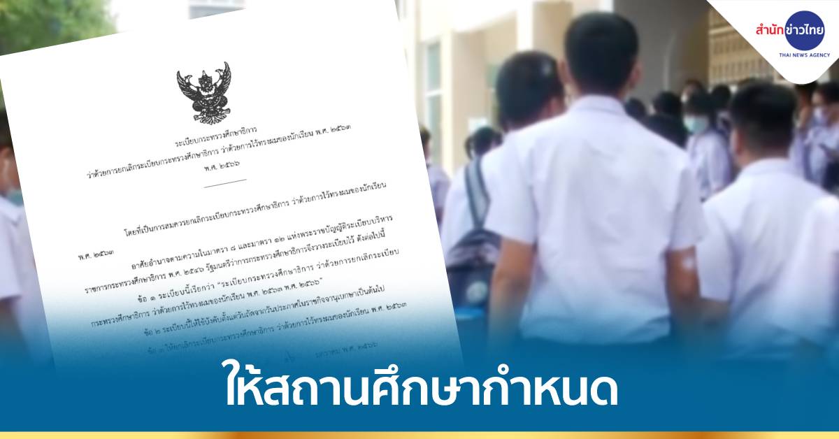 ทั้งนี้ ระเบียบกระทรวงศึกษาธิการว่าด้วยการไว้ทรงผมของนักเรียน พ.ศ.2563 ที่ใช้อยู่ในปัจจุบัน มีข้อต้องปฏิบัติตนเกี่ยวกับการไว้ทรงผมว่า นักเรียนชายจะไว้ผมสั้นหรือผมยาวก็ได้ กรณีไว้ผมยาวด้านข้าง ด้านหลังต้องยาว ไม่เลยตีนผม ด้านหน้าและกลางศีรษะให้เป็นไปตามความเหมาะสมและมีความเรียบร้อย นักเรียนหญิงจะไว้ผมสั้นหรือผมยาวก็ได้ กรณีไว้ผมยาวให้เป็นไปตามความเหมาะสมและรวบให้เรียบร้อย และมีข้อต้องห้ามปฏิบัติตน ดังนี้ ดัดผม ย้อมสีผมให้ผิดไปจากเดิม ไว้หนวดหรือเครา การกระทำอื่นใดซึ่งไม่เหมาะสมกับสภาพการเป็นนักเรียน เช่น การตัดแต่งทรงผมเป็นรูปทรงสัญลักษณ์หรือเป็นลวดลาย แต่ต่อไปหลังจากมีการประกาศยกเลิกในราชกิจจานุเบกษาแล้ว เรื่องการไว้ทรงผมของนักเรียนทั้งหมดจะอยู่ที่สถานศึกษา ซึ่งเป็นแนวปฏิบัติที่ได้มาจากการมีส่วนร่วมของทุกฝ่าย.-สำนักข่าวไทย