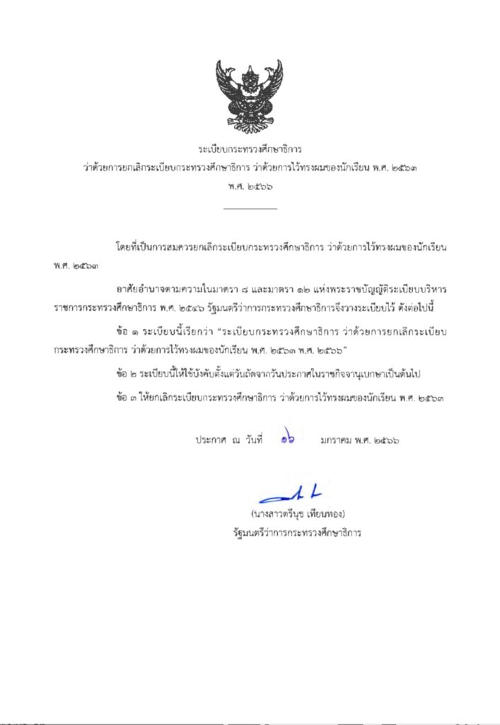 ศธ. 24 ม.ค.- รมว.ศึกษาฯ สั่งยกเลิกระเบียบ ศธ.ว่าด้วยการไว้ทรงผมของนักเรียน ไว้ผมสั้นหรือผมยาวก็ได้ และให้สถานศึกษาอาจกำหนดลักษณะทรงผมได้ โดยจัดรับฟังความคิดเห็นจากผู้มีส่วนเกี่ยวข้อง ก่อนประกาศใช้
