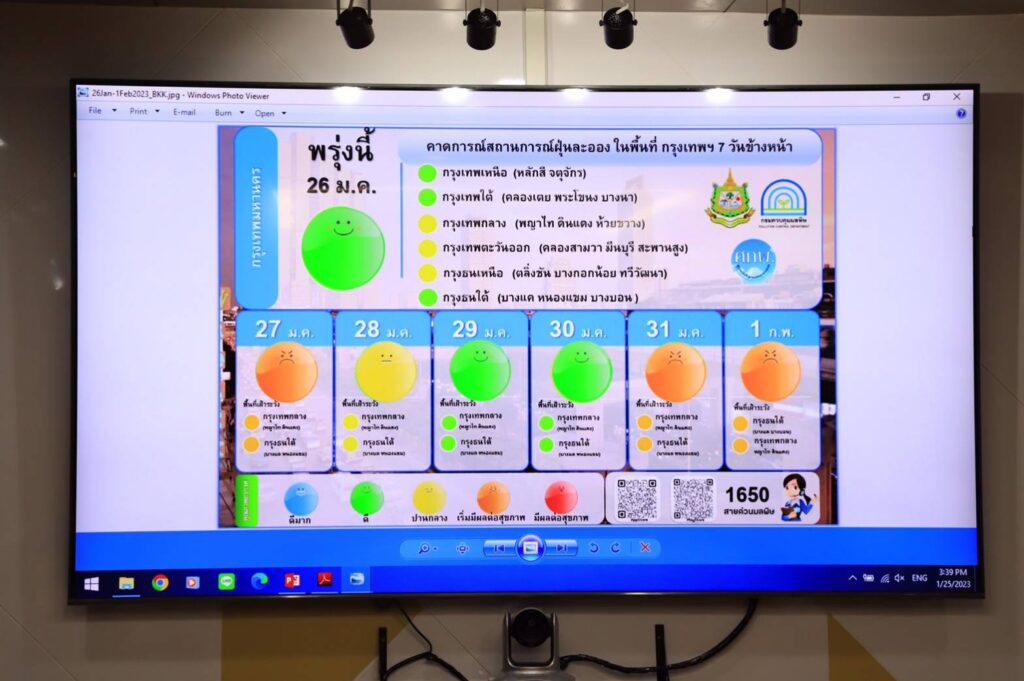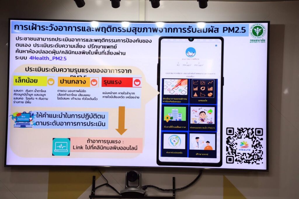 นพ.เอกชัย เพียรศรีวัชรา รองอธิบดีกรมอนามัย กล่าวว่า จากรายงานเฝ้าระวังของกรมควบคุมมลพิษและกรุงเทพมหานคร สถานการณ์ฝุ่น PM2.5 ในพื้นที่กรุงเทพมหานครมีแนวโน้มสูงขึ้นในช่วงวันที่ 27-28 มกราคม 2566 และ 31 มกราคม-1 กุมภาพันธ์ 2566 เนื่องจากสภาพอากาศนิ่งและปิด ซึ่งจะส่งผลกระทบต่อสุขภาพในระบบต่าง ๆ เช่น ระบบตา ผิวหนัง ระบบทางเดินหายใจ และระบบหัวใจและหลอดเลือด หากร่างกายได้รับสัมผัส PM2.5 เข้าไป จะก่อให้เกิดอาการต่าง ๆ โดยความรุนแรงของอาการมีตั้งแต่ระดับเล็กน้อย เช่น แสบตา คันตา น้ำตาไหล คัดจมูก มีน้ำมูก แสบจมูก แสบคอ ไอแห้ง ๆ คันตามร่างกาย มีผื่น อาการ ระดับปานกลาง เช่น ตาแดง มองภาพไม่ชัด เลือดกำเดาไหล เสียงแหบ ไอมีเสมหะ หัวใจเต้นเร็ว และอาการระดับรุนแรง เช่น แน่นหน้าอก หายใจลำบาก หายใจมีเสียงหวีด เหนื่อยง่าย หากมีอาการรุนแรง ต้องรีบไปพบแพทย์ทันที
