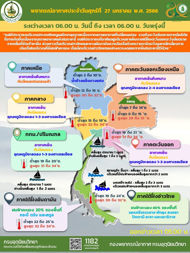 กรมอุตุนิยมวิทยา พยากรณ์อากาศ 24 ชั่วโมงข้างหน้า บริเวณความกดอากาศสูงหรือมวลอากาศเย็นกำลังแรงอีกระลอกหนึ่งจากประเทศจีนได้แผ่ปกคลุมถึงประเทศเวียดนามตอนบนแล้ว และจะแผ่ปกคลุมประเทศไทยตอนบนในคืนนี้ ซึ่งจะทำให้ประเทศไทยตอนบนมีอากาศเย็นถึงหนาว กับมีลมแรง อุณหภูมิจะลดลง 2 – 4 องศาเซลเซียส ขอให้ประชาชนบริเวณประเทศไทยดูแลรักษาสุขภาพเนื่องจากสภาพอากาศที่เปลี่ยนแปลง รวมถึงระวังอันตรายจากอัคคีภัยที่อาจเกิดขึ้นเนื่องจากสภาพอากาศแห้งและลมแรงในระยะนี้