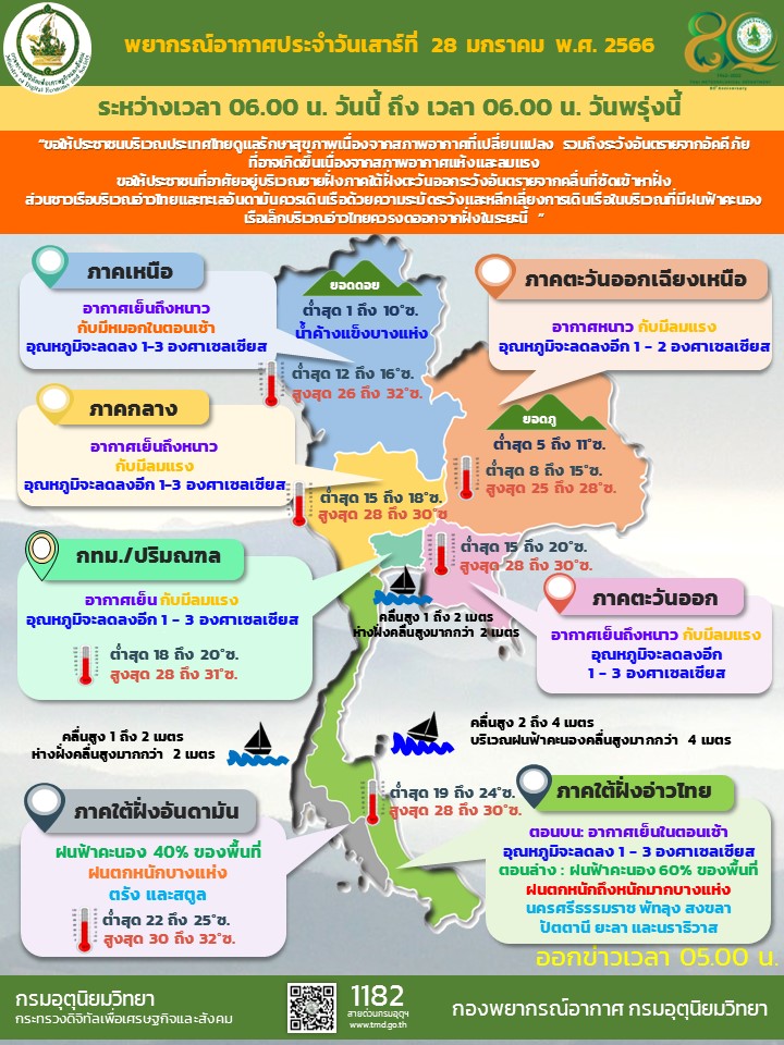 กทม. 28 ม.ค.- กรมอุตุฯ เผยไทยตอนบนอากาศหนาวเย็น อุณหภูมิจะลดลงอีก 1-3 องศาเซลเซียส ส่วนภาคใต้ตอนล่างมีฝนเพิ่มขึ้นและตกหนักถึงหนักมากบางแห่ง