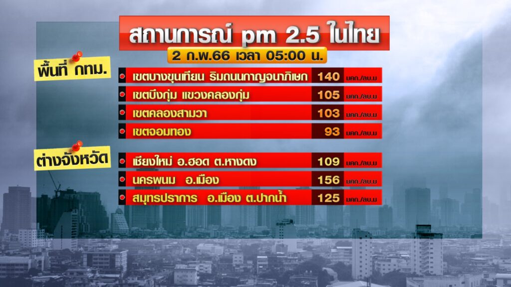 ขณะที่ ศูนย์ข้อมูลคุณภาพอากาศ กรุงเทพมหานคร รายงานสถานการณ์ฝุ่นละออง PM2.5 ในพื้นที่กรุงเทพฯ วันนี้รายงานว่า จากบริเวณความกดอากาศสูงหรือมวลอากาศเย็นกำลังค่อนข้างแรงอีกระลอกแผ่เสริมลงมาปกคลุมประเทศไทย ประกอบกับสภาพอากาศที่นิ่งและปิด ทำให้มีการสะสมของฝุ่นละออง PM 2.5 เพิ่มขึ้น ส่งผลให้พื้นที่กรุงเทพฯ มีค่าฝุ่นเกินมาตรฐาน 50 ไมโครกรับต่อลูกบาศก์เมตร 70 พื้นที่ ค่าเฉลี่ยที่ 71-121 ไมโครกรัมต่อลูกบาศก์เมตร โดยสูงสุดอยู่ที่เขตหนองแขม สามแยกข้างป้อมตำรวจ ถนนมาเจริญ เพชรเกษม 81 วัดได้ 121 ไมโครกรัมต่อลูกบาศก์เมตร ส่วนการคาดการณ์คุณภาพอากาศยังคงพบว่า วันที่ 3-4 กุมภาพันธ์ 2566 พื้นที่กรุงเทพและปริมณฑลต้องเฝ้าระวังการสะสมของฝุ่นละอองต่อเนื่อง