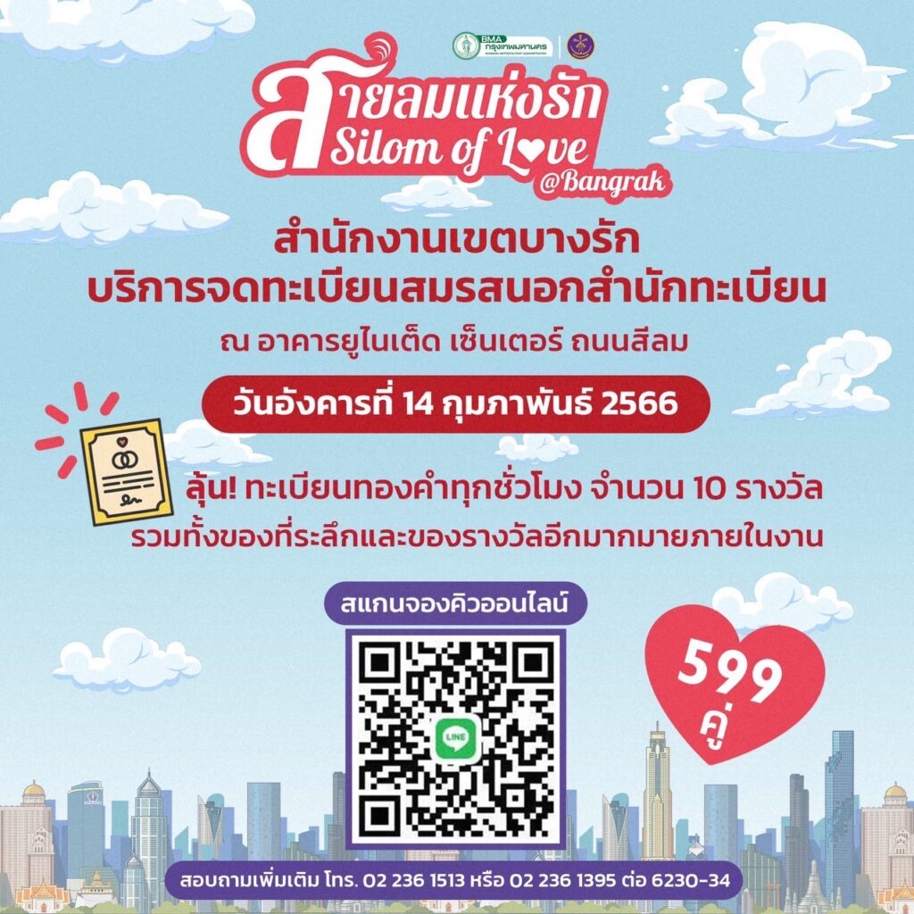งาน “สายลมแห่งรัก (Silom of Love @Bangrak)” จะจัดขึ้นในวันอังคารที่ 14 กุมภาพันธ์ 2566 ณ อาคารยูไนเต็ด เซ็นเตอร์ (ชั้น 17) ถนนสีลม เขตบางรัก โดยสำนักงานเขตบางรักได้จัดเจ้าหน้าที่เตรียมพร้อมบริการจดทะเบียนสมรส โดยจะเริ่มเปิดตรวจสอบคำร้องตั้งแต่เวลา 07.00-16.00 น. กิจกรรมในงาน อาทิ พิธีแห่ขบวนขันหมากจำลองตามรูปแบบของวัฒนธรรมไทย การจดทะเบียนสมรสจริงให้กับคู่สมรสตัวอย่าง และเริ่มต้นจดทะเบียนสมรสคู่แรกเวลา 08.00 น. ซึ่งคู่รักที่มาร่วมงานจะได้รับของที่ระลึกทุกคู่ และทุกชั่วโมงจะมีการจับสลากมอบทะเบียนสมรสทองคำ ชั่วโมงละ 1 ฉบับ รวมทั้งสิ้น 10 ฉบับ นอกจากนี้ยังมีกิจกรรมให้คู่สมรสได้ร่วมสนุกภายในงาน เพื่อลุ้นรับของรางวัลมากมาย