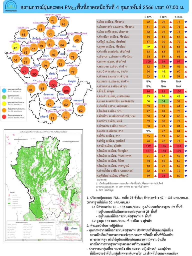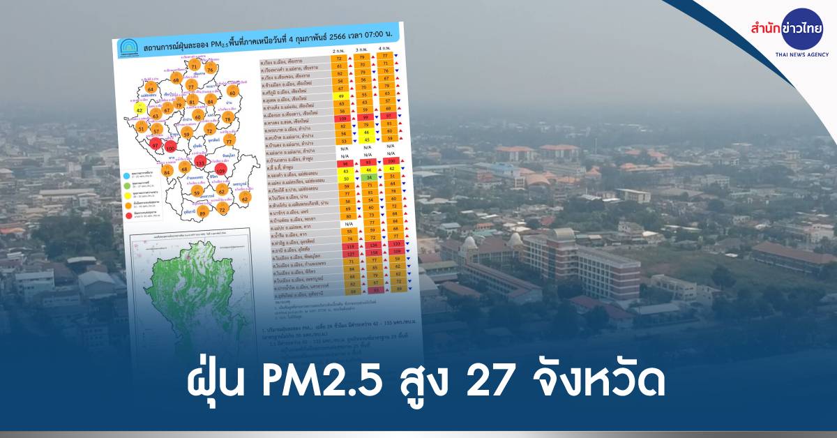 กทม. 4 ก.พ.-เช้านี้ ฝุ่น PM2.5 เกินค่ามาตรฐาน 27 จังหวัด ภาคเหนือตัวเลขสูงสุดอยู่ที่ 133 มคก./ลบ.ม. พิษณุโลก ค่าฝุ่นสูงต่อเนื่องวันที่ 3