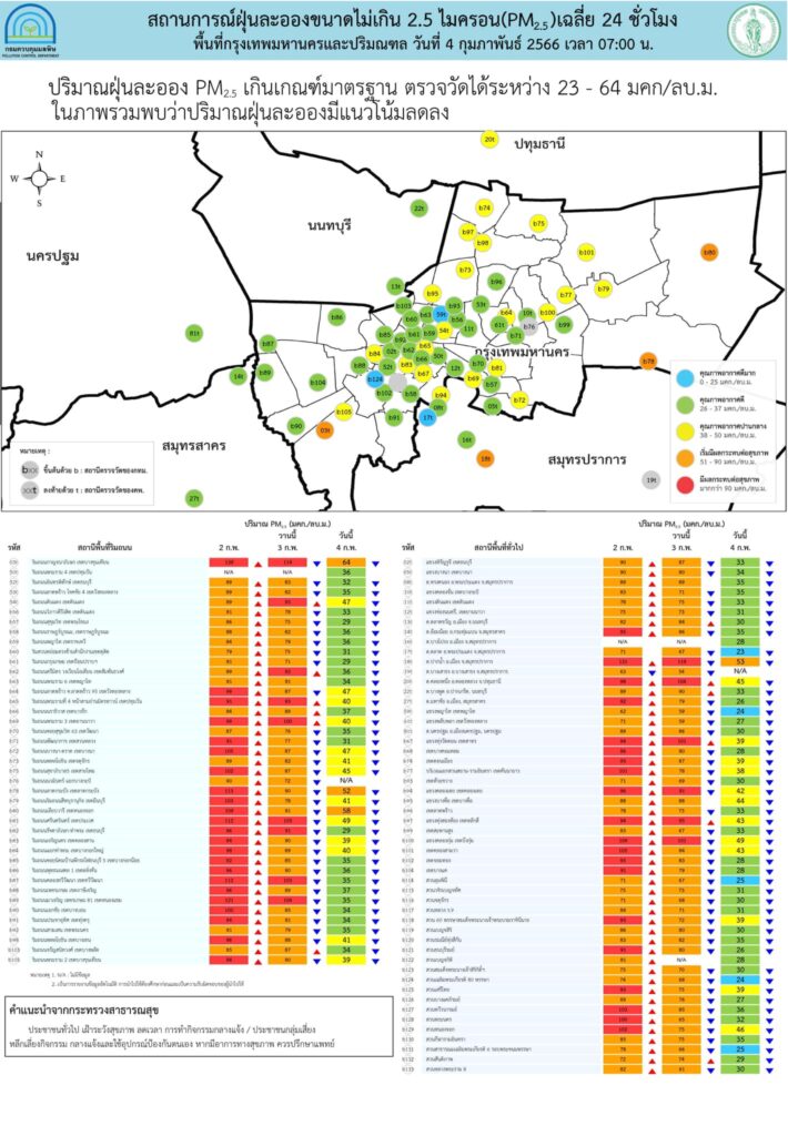 กองจัดการคุณภาพอากาศและเสียง กรมควบคุมมลพิษ รายงานคุณภาพอากาศเช้านี้ ภาพรวม PM2.5 ในประเทศ เกินค่ามาตรฐาน 27 จังหวัด โดยภาคเหนือตัวเลขสูงสุดอยู่ที่ 133 ไมโครกรัมต่อลูกบาศก์เมตร กรุงเทพฯ เกินค่ามาตรฐาน บริเวณริมถนนกาญจนาภิเษก เขตบางขุนเทียน, ริมถนนลาดกระบัง เขตลาดกระบัง และริมถนนเลียบวารี เขตหนองจอก ค่าสูงสุดอยู่ที่ 64 ไมโครกรัมต่อลูกบาศก์เมตร อย่างไรก็ตาม คาดการณ์ว่าตั้งแต่วันพรุ่งนี้อากาศจะเปิดมากขึ้น มีลมใต้กำลังค่อนข้างแรงช่วยพัดฝุ่นละอองออกจากพื้นที่ ทำให้คุณภาพอากาศดีขึ้นตามลำดับ