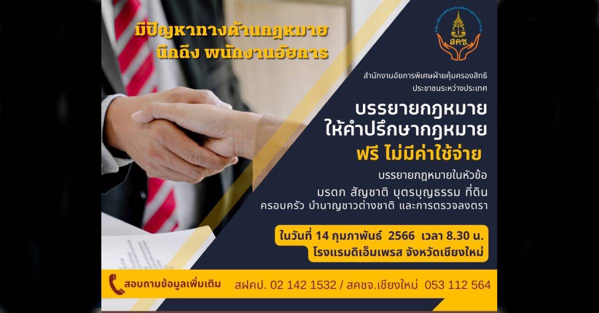 สำนักงานอัยการสูงสุด โดยสำนักงานคุ้มครองสิทธิและช่วยเหลือทางกฎหมายแก่ประชาชน (สคช.) กำหนดจัดโครงการคลินิกอัยการอาสาเคลื่อนที่คุ้มครองสิทธิประชาชนระหว่างประเทศ ประจำปีงบประมาณ พ.ศ.2566 ในพื้นที่จังหวัดเชียงใหม่ เพื่อให้ความรู้ทางกฎหมายให้กับคนไทยที่มีนิติสัมพันธ์กับคนต่างชาติและคนต่างชาติที่อยู่ในประเทศไทย เนื่องจากกฎหมายที่เกี่ยวข้องมีความแตกต่างไปจากการมีนิติสัมพันธ์ระหว่างคนไทยด้วยกันเอง และเป็นการคุ้มครองทางกฎหมายแก่คนต่างชาติที่อยู่ในประเทศด้วย โดยภายในงานมีกิจกรรมต่างๆ ประกอบด้วย การบรรยายเกี่ยวกับการให้ความช่วยเหลือของสำนักงานอัยการสูงสุดแก่ประชาชนทั่วไป, กฎหมายปกครอง, กฎหมายคนเข้าเมือง และกฎหมายอื่นๆ ที่เกี่ยวข้อง อาทิ การเกณฑ์ทหารของคนสองสัญชาติ, การถือครองทรัพย์สินและมรดกของคนต่างชาติในไทย เป็นต้น และยังมีการเปิดคลินิกกฎหมายให้คำปรึกษาเป็นการเฉพาะรายด้วย
