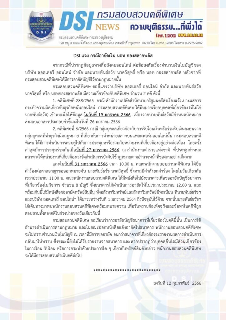 จากกรณีปรากฏข้อมูลทางสื่อสังคมออนไลน์ ต่อข้อสงสัยเรื่องจำนวนเงินในบัญชีของ บริษัท ลอตเตอรี่ ออนไลน์ จำกัด และนายพันธ์ธวัช นาควิสุทธิ์ หรือ นอท กองสลากพลัส หลังจากที่กรมสอบสวนคดีพิเศษได้มีการอายัดบัญชีไว้ตามกฎหมายนั้น