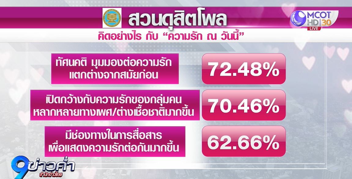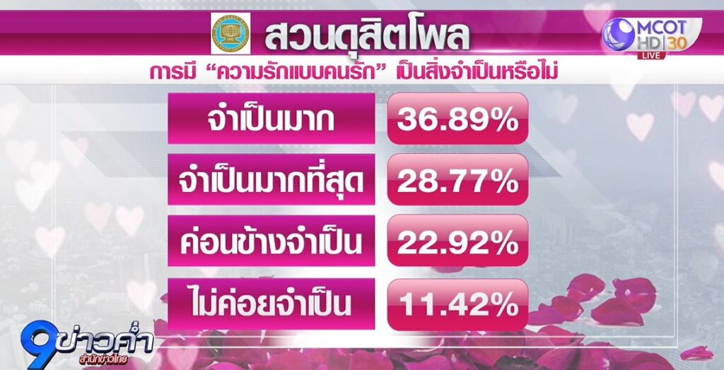สวนดุสิตโพลเผยผลสำรวจ “มุมมองความรักของคนไทย ณ วันนี้” เก็บตัวอย่างแบบผสมผสานทางออนไลน์ สำรวจความคิดเห็นของประชาชนจำนวน 1,095 คน ระหว่างวันที่ 5-9 กุมภาพันธ์ 2566 พบว่าปัจจุบันคนไทยมีทัศนคติ มุมมองต่อความรักแตกต่างจากสมัยก่อน ร้อยละ 72.48 โดยมองว่าการมี “ความรักแบบคนรัก” เป็นสิ่งจำเป็นมาก ร้อยละ 36.89
