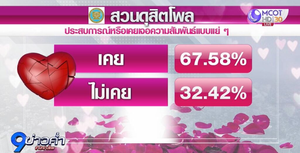 ทั้งนี้ เคยมีประสบการณ์หรือเคยเจอความสัมพันธ์แบบแย่ๆ (Toxic relationship) ร้อยละ 67.58 ส่วนการแสดงความรัก ปกติแล้วมักแสดงความรักด้วยการใช้เวลาและทำกิจกรรมร่วมกัน ร้อยละ 66.64 วิธีการรักษา/ถนอมความรัก คือ เข้าใจกัน รับฟังอย่างมีเหตุผล ร้อยละ 82.77 ในวันวาเลนไทน์หรือวันแห่งความรักที่จะถึงนี้คาดว่าจะใช้จ่ายเฉลี่ยประมาณ 1,528.95 บาทต่อคน ส่วนของขวัญที่อยากได้ในวันวาเลนไทน์ อันดับ 1 คือดอกไม้ ช่อดอกไม้ ร้อยละ 48.07 รองลงมาคือ รับประทานอาหารด้วยกัน ร้อยละ 31.93 และเงิน ร้อยละ 23.86