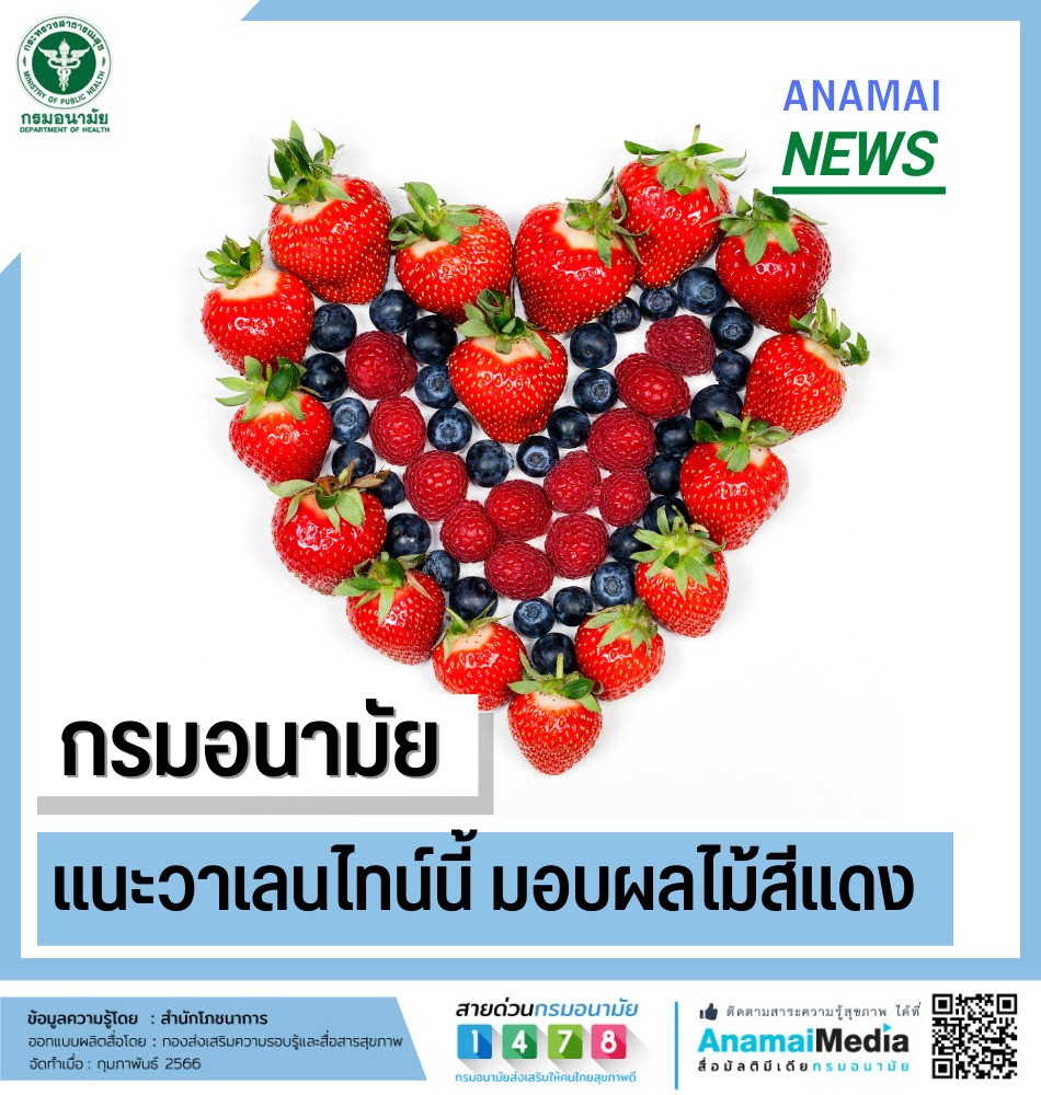 สธ. 14 ก.พ.- กรมอนามัย ก.สาธารณสุข แนะวาเลนไทน์นี้มอบผลไม้สีแดงเป็นสื่อรักแทนใจ เพื่อเติมความหวานให้แก่กัน ทั้งได้ประโยชน์ และได้สุขภาพ แทนการมอบขนมหวาน ลดการเพิ่มน้ำตาล ช่วยลดอ้วน