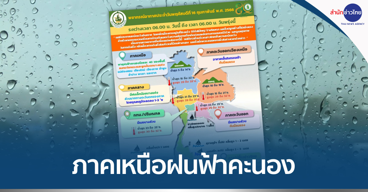 กรมอุตุนิยมวิทยา พยากรณ์อากาศ 24 ชั่วโมงข้างหน้า คลื่นกระแสลมฝ่ายตะวันตกจะเคลื่อนผ่านภาคเหนือ ในช่วงวันที่ 16 – 17 ก.พ. 66 ทำให้ภาคเหนือ มีพายุฝนฟ้าคะนอง ลมกระโชกแรง และลูกเห็บตกบางแห่ง ขอให้ประชาชนระมัดระวังอันตรายดังกล่าว โดยหลีกเลี่ยงการอยู่ในที่โล่งแจ้ง ใต้ต้นไม้ใหญ่ ป้ายโฆษณา และสิ่งปลูกสร้างที่ไม่แข็งแรง สำหรับเกษตรกรควรเตรียมการป้องกันและระวังความเสียหายที่จะเกิดต่อผลผลิตทางการเกษตรไว้ด้วย และดูแลสุขภาพเนื่องจากสภาพอากาศที่เปลี่ยนแปลงในระยะนี้