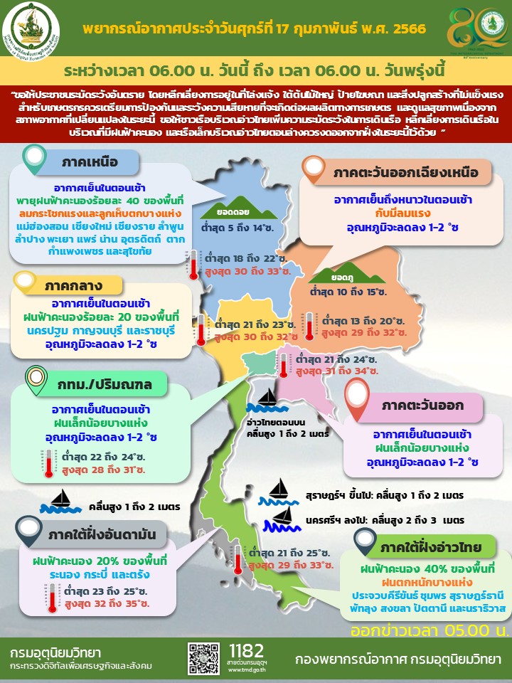 ภาคตะวันออกเฉียงเหนือ : อากาศเย็นถึงหนาวในตอนเช้ากับมีลมแรง โดยอุณหภูมิจะลดลงอีก 1-2 องศาเซลเซียส อุณหภูมิต่ำสุด 13-20 องศาเซลเซียส อุณหภูมิสูงสุด 29-32 องศาเซลเซียส บริเวณยอดภูอากาศเย็นถึงหนาว อุณหภูมิต่ำสุด 10-15 องศาเซลเซียส ลมตะวันออกเฉียงเหนือ ความเร็ว 15-30 กม./ชม.