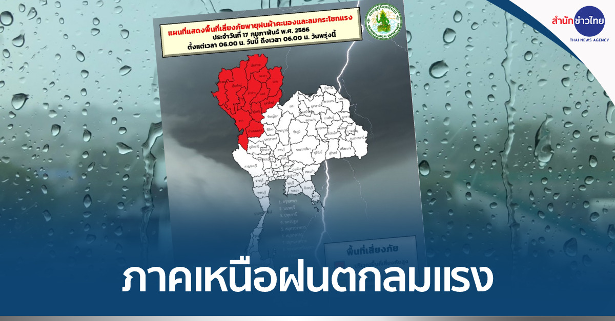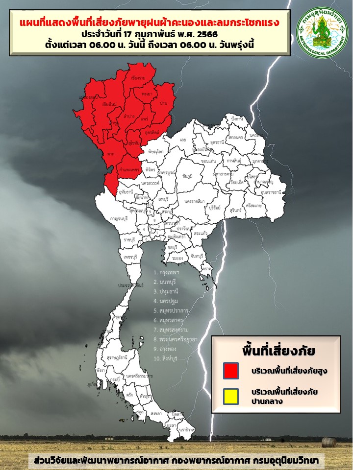 กรมอุตุนิยมวิทยา พยากรณ์อากาศ 24 ชั่วโมงข้างหน้า คลื่นกระแสลมฝ่ายตะวันตกเคลื่อนเข้าปกคลุมภาคเหนือ ทำให้ภาคเหนือมีพายุฝนฟ้าคะนอง ลมกระโชกแรง และลูกเห็บตกบางแห่ง หลังจากนั้นอุณหภูมิจะลดลงอีก 2-4 องศาเซลเซียส ขอให้ประชาชนระมัดระวังอันตราย โดยหลีกเลี่ยงการอยู่ในที่โล่งแจ้ง ใต้ต้นไม้ใหญ่ ป้ายโฆษณา และสิ่งปลูกสร้างที่ไม่แข็งแรง สำหรับเกษตรกรควรเตรียมการป้องกันและระวังความเสียหายที่จะเกิดต่อผลผลิตทางการเกษตร และดูแลสุขภาพเนื่องจากสภาพอากาศที่เปลี่ยนแปลงในระยะนี้ ในขณะที่บริเวณความกดอากาศสูงกำลังค่อนข้างแรงจากประเทศจีนปกคลุมประเทศไทยตอนบน ทำให้บริเวณดังกล่าวมีอากาศเย็นถึงหนาวในตอนเช้า และอุณหภูมิจะลดลง 1-2 องศาเซลเซียส