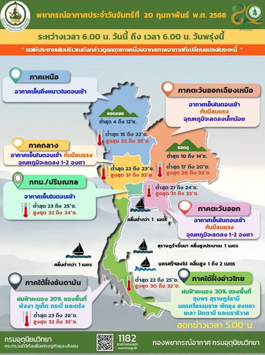 กรมอุตุฯ 20 ก.พ. – กรมอุตุฯ เผยภาคอีสาน ภาคกลาง และภาคตะวันออก อากาศเย็นในตอนเช้า กับมีลมแรง อุณหภูมิลดลงอีก 1-2 องศาฯ ส่วนกรุงเทพฯ-ปริมณฑล อุณหภูมิต่ำสุด 23-25 องศาฯ ขณะที่ภาคใต้ยังมีฝนฟ้าคะนองบางแห่ง