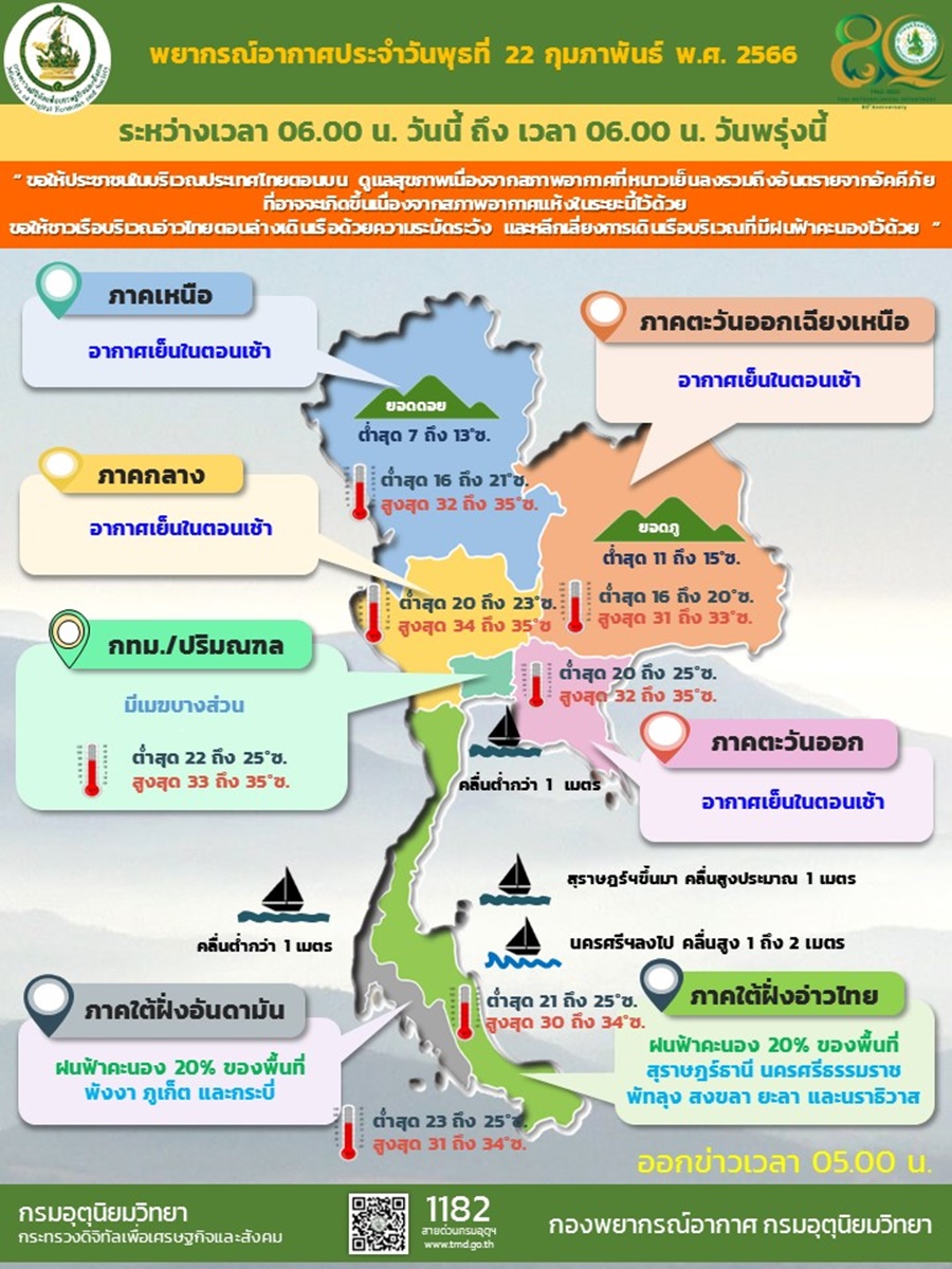 กรมอุตุฯ 22 ก.พ. – กรมอุตุฯ เผยไทยตอนบนอากาศเย็นในตอนเช้า กรุงเทพฯ-ปริมณฑล อุณหภูมิต่ำสุด 22-25 องศาฯ ขณะที่ภาคใต้มีฝนฟ้าคะนองบางแห่ง