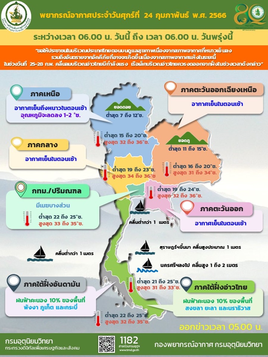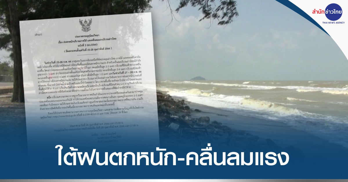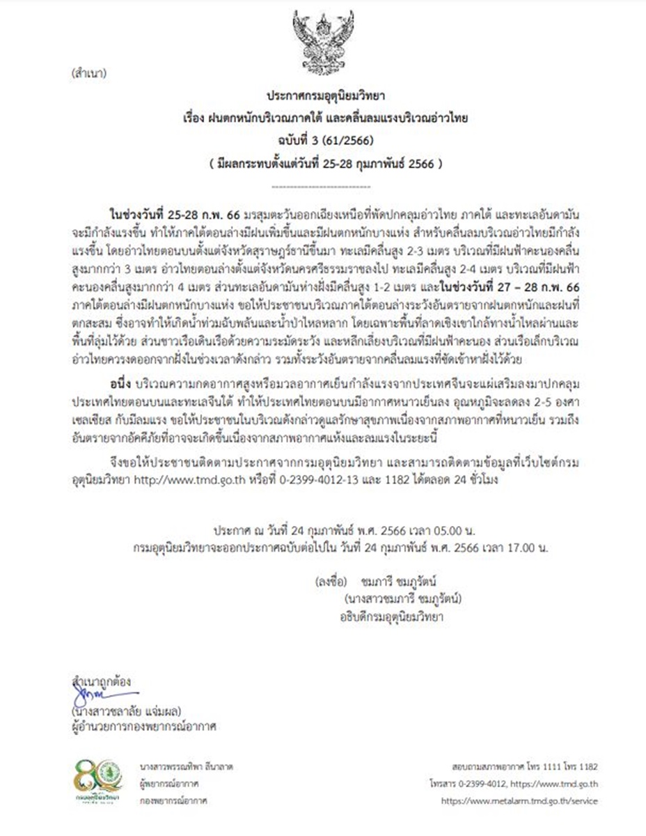 กรมอุตุนิยมวิทยา ออกประกาศ เรื่อง ฝนตกหนักบริเวณภาคใต้ และคลื่นลมแรงบริเวณอ่าวไทย ฉบับที่ 3 (มีผลกระทบตั้งแต่วันที่ 25-28 กุมภาพันธ์ 2566) ระบุว่า ในช่วงวันที่ 25-28 ก.พ.66 มรสุมตะวันออกเฉียงเหนือที่พัดปกคลุมอ่าวไทย ภาคใต้ และทะเลอันดามัน จะมีกำลังแรงขึ้น ทำให้ภาคใต้ตอนล่างมีฝนเพิ่มขึ้นและมีฝนตกหนักบางแห่ง สำหรับคลื่นลมบริเวณอ่าวไทยมีกำลังแรงขึ้น โดยอ่าวไทยตอนบน ตั้งแต่ จ.สุราษฎร์ธานี ขึ้นมา ทะเลมีคลื่นสูง 2-3 เมตร บริเวณที่มีฝนฟ้าคะนองคลื่นสูงมากกว่า 3 เมตร อ่าวไทยตอนล่าง ตั้งแต่ จ.นครศรีธรรมราช ลงไป ทะเลมีคลื่นสูง 2-4 เมตร บริเวณที่มีฝนฟ้าคะนองคลื่นสูงมากกว่า 4 เมตร ส่วนทะเลอันดามันห่างฝั่งมีคลื่นสูง 1-2 เมตร และในช่วงวันที่ 27-28 ก.พ.66 ภาคใต้ตอนล่างมีฝนตกหนักบางแห่ง ขอให้ประชาชนบริเวณภาคใต้ตอนล่างระวังอันตรายจากฝนตกหนักและฝนที่ตกสะสม ซึ่งอาจทำให้เกิดน้ำท่วมฉับพลันและน้ำป่าไหลหลาก โดยเฉพาะพื้นที่ลาดเชิงเขาใกล้ทางน้ำไหลผ่านและพื้นที่ลุ่ม ส่วนชาวเรือเดินเรือด้วยความระมัดระวัง และหลีกเลี่ยงบริเวณที่มีฝนฟ้าคะนอง ส่วนเรือเล็กบริเวณอ่าวไทยควรงดออกจากฝั่งในช่วงเวลาดังกล่าว รวมทั้งระวังอันตรายจากคลื่นลมแรงที่ซัดเข้าหาฝั่ง