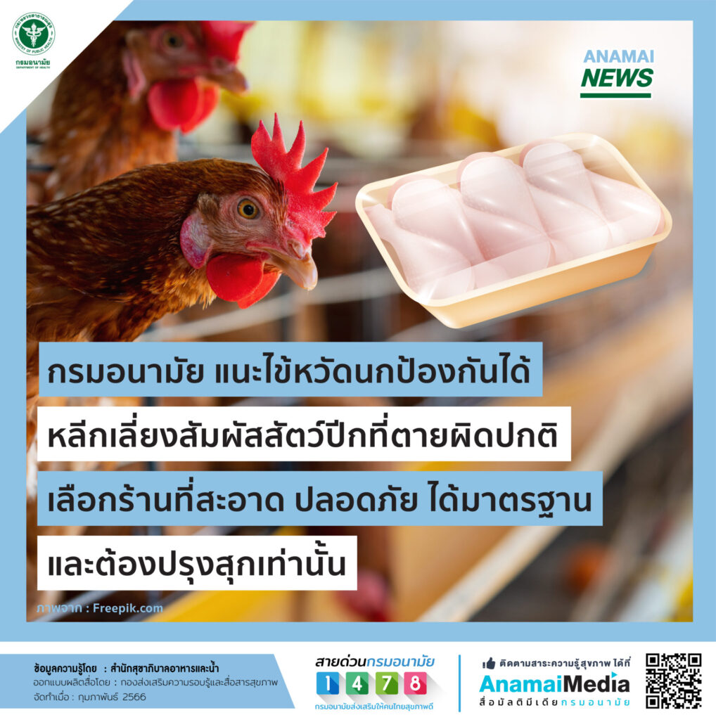 “สำหรับประชาชนควรเลือกเนื้อไก่และเป็ดสดจากแหล่งที่มีการรับรองมาตรฐานหรือร้านค้าประจำ และเลือกซื้อไก่และเป็ดสดที่ไม่มีลักษณะบ่งชี้ว่าอาจจะตายด้วยโรคติดเชื้อ เช่น เนื้อมีสีคล้ำ มีจุดเลือดออก ส่วนไข่ให้เลือกซื้อฟองที่ดูสดใหม่ไม่มีมูลไก่หรือเป็ดติดเปื้อนที่เปลือกไข่ และล้างทำความสะอาดก่อนนำมาปรุง การปรุงประกอบอาหารไก่ เป็ด ควรผ่านการปรุงให้สุกโดยใช้ความร้อนให้อาหารสุกอย่างทั่วถึงด้วยอุณหภูมิตั้งแต่ 70 องศาฯ ขึ้นไป เป็นระยะเวลาอย่างน้อย 5 นาที เพื่อลดความเสี่ยงต่อการปนเปื้อนเชื้อโรครวมทั้งยาฆ่าแมลงตกค้าง หากมีอาการไม่สบาย เช่น มีไข้ ปวดศีรษะ หนาวสั่น เจ็บคอ ไอ ต้องรีบไปพบแพทย์ทันที กรณีทำงานในฟาร์มเลี้ยงสัตว์หรือมีประวัติสัมผัสซากสัตว์ต้องแจ้งแพทย์ด้วย”. -สำนักข่าวไทย