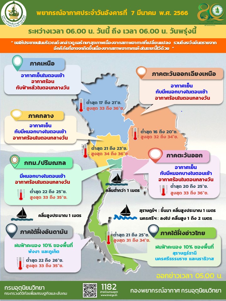 กรุงเทพฯ 7 มี.ค. – ไทยตอนบนอากาศร้อนตอนกลางวัน แต่ยังมีอากาศเย็นกับหมอกบางตอนเช้า ส่วนภาคใต้ ฝนฟ้าคะนองบางแห่ง
