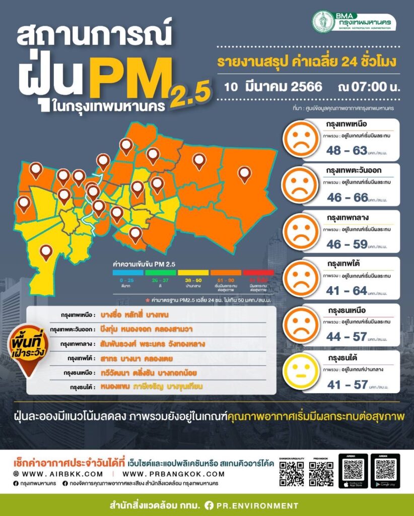 ศูนย์ข้อมูลคุณภาพอากาศกรุงเทพมหานคร สรุปผลการตรวจวัด PM2.5 (3 ชั่วโมงล่าสุด) ตรวจวัดได้ 37-68 มคก./ลบ.ม. ค่าเฉลี่ยของกรุงเทพมหานคร 51.7 มคก./ลบ.ม. ค่า PM2.5 มีแนวโน้มลดลง แต่ยังคงเกินมาตรฐานอยู่ในระดับสีส้มเริ่มมีผลกระทบต่อสุขภาพบางพื้นที่