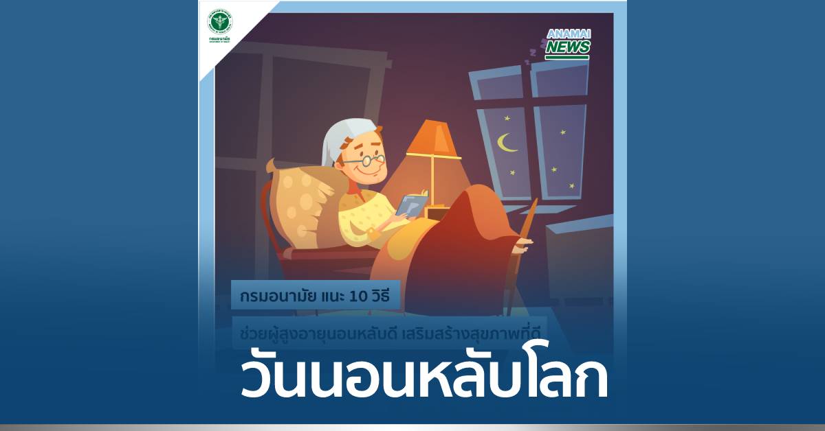สธ. 10 มี.ค.- กรมอนามัย แนะ 10 วิธี ช่วยผู้สูงอายุมีสุขอนามัยการนอนหลับและสุขภาพที่ดี พร้อมชวนคนไทยทุกกลุ่มวัยหันมาใส่ใจการนอนหลับพักผ่อนให้เพียงพอและสม่ำเสมอ เนื่องในวันนอนหลับโลก (World Sleep Day) วันศุกร์ที่ 10 มี.ค.