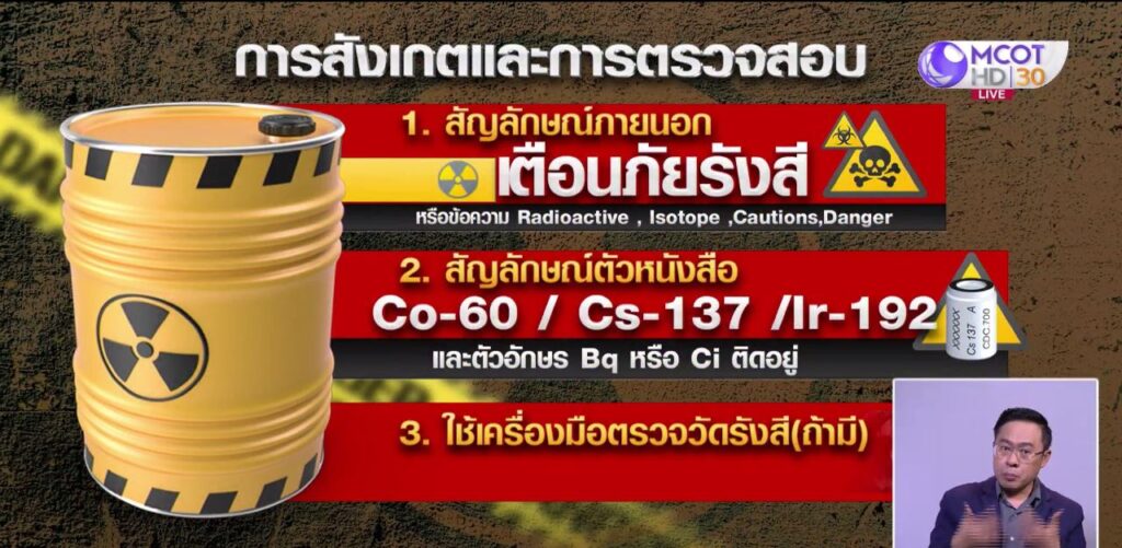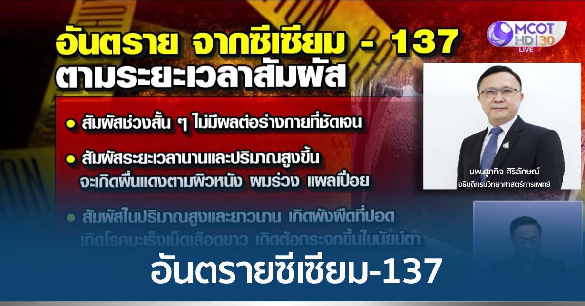 กทม. 20 มี.ค. – นพ.ศุภกิจ ศิริลักษณ์ อธิบดีกรมวิทยาศาสตร์การแพทย์ ให้สัมภาษณ์ถึงผลกระทบและอันตรายจากสารกัมมันตรังสี ซีเซียม-137 หากมีผู้สัมผัส จะมีผลสำคัญคือ ทำให้เซลล์ของมนุษย์เกิดความผิดปกติ ส่วนจะเกิดมากน้อยแค่ไหน ขึ้นกับว่ารังสีที่ออกมานั้นรุนแรงแค่ไหน และระยะเวลาที่สัมผัส และวิธีที่สัมผัส เช่น อยู่ห่าง อยู่ใกล้ และสารกัมมันตรังสีแต่ละตัวจะมีคุณสมบัติแตกต่างกันไป ซึ่งรังสีพวกนี้มีทั้งประโยชน์และอันตราย หากนำมาใช้ทางการแพทย์ คือ รังสีรักษา