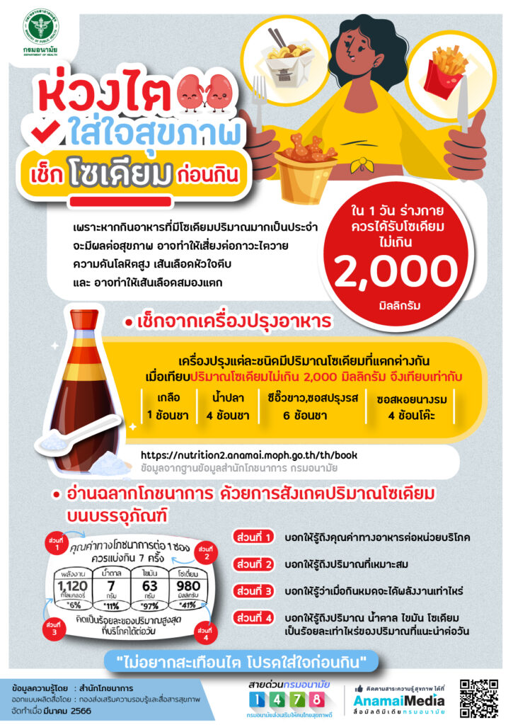 นพ.สุวรรณชัย วัฒนายิ่งเจริญชัย อธิบดีกรมอนามัย กล่าวว่า จากกรณีกรมอนามัยเผยข้อมูลประเทศไทย เป็น 1 ใน 5 ประเทศที่มีอัตราการเกิดโรคไตสูงที่สุด แนะวิธีการป้องกันโรคไตเริ่มต้นง่าย ๆ แค่ลดการบริโภคโซเดียม ร่างกายคนเราไม่ควรได้รับโซเดียมเกิน 2,000 มิลลิกรัมต่อวัน ส่งผลให้ประชาชนอยากให้ช่วยขยายความ “กินโซเดียมไม่เกิน 2,000 ต่อวันนั้น คือ ประมาณเท่าไหร่? จะชั่ง ตวง วัด ได้อย่างไร?” ผ่านกระทู้ในหนังสือพิมพ์ กรมอนามัยจึงขอแนะนำวิธีเช็กโซเดียมใน 1 วัน เพื่อให้ประชาชนไม่สับสนและเข้าใจง่าย สำหรับดูแลสุขภาพตนเอง และคนรอบข้างเพื่อการมีสุขภาพที่ดี