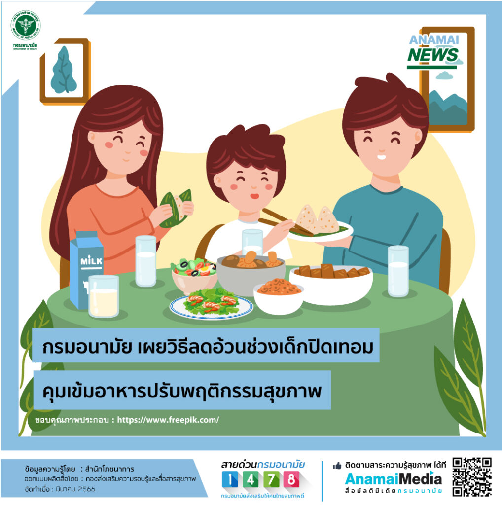 นพ.สุวรรณชัย วัฒนายิ่งเจริญชัย อธิบดีกรมอนามัย กล่าวว่า ช่วงปิดเทอมเด็กๆ อยู่บ้านมากขึ้น ส่งผลให้พฤติกรรมส่วนใหญ่ของเด็กเปลี่ยนไป จะนอนดึก ตื่นสาย พักผ่อนไม่เพียงพอ เพราะใช้เวลาในการเล่นเกม เล่นโทรศัพท์ งดมื้อเช้า เลือกกินขนม น้ำอัดลม น้ำหวาน และมีพฤติกรรมเนือยนิ่งเพิ่มมากขึ้น ส่งผลให้เด็กมีน้ำหนักตัวเพิ่มมากขึ้น และเสี่ยงต่อการเป็นโรคต่างๆ ทั้งนี้ จากรายงานข้อมูลภาวะโภชนาการของกระทรวงสาธารณสุข ปี 2566 เมื่อวันที่ 12 มีนาคม 2566 พบเด็กอายุ 6-14 ปี มีภาวะเริ่มอ้วนและอ้วน ร้อยละ 13.2 และเด็กอายุ 15-18 ปี มีภาวะเริ่มอ้วนและอ้วน ร้อยละ 13.0 ซึ่งเกินกว่าค่าเป้าหมายที่ตั้งไว้ ไม่เกิน ร้อยละ 12.0 และจากข้อมูลในปี 2538-2557 พบว่า เด็กไทยติด 1 ใน 3 ของอาเซียนที่มีภาวะน้ำหนักเกิน และมีภาวะเริ่มอ้วนและอ้วนเพิ่มขึ้นเป็น 2 เท่า อีกทั้ง 1 ใน 2 ของเด็กอายุ 12 ปี ดื่มเครื่องดื่มรสหวานและน้ำอัดลมมากกว่า 2 ครั้งต่อวัน และ 1 ใน 3 ของเด็กไทยกินขนมถุงเป็นประจำทุกวันมากกว่า 2 ครั้ง นอกจากนี้จากการเก็บข้อมูลยังพบว่า 9 ใน 10 ของเด็กไทยเห็นสื่อโฆษณาอาหารและเครื่องดื่มที่มีน้ำตาล ไขมัน และโซเดียมสูง ซึ่งการเห็นสื่อโฆษณาบ่อย ๆ จะกระตุ้นการกินของเด็กทำให้อยากได้ อยากกินตามโฆษณา และมากกว่า 3 ใน 4 ของเด็กไทยที่ไม่เห็นข้อความเตือนในโฆษณาอาหารและเครื่องดื่ม