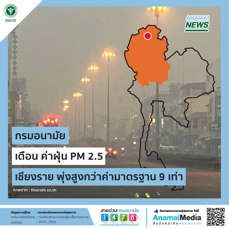 นพ.สุวรรณชัย วัฒนายิ่งเจริญชัย อธิบดีกรมอนามัย กล่าวว่า จากการเฝ้าระวังสถานการณ์ฝุ่นละอองขนาดเล็ก ในวันที่ 26 มีนาคม 2566 เวลา 11.00 น. พบค่าฝุ่น PM 2.5 สูงถึง 480 ไมโครกรัม/ลูกบาศก์เมตร ในพื้นที่ ต.เวียงพางคำ อ.แม่สาย จ.เชียงราย ซึ่งสูงกว่าค่ามาตรฐานเฉลี่ย 24 ชั่วโมงของประเทศไทย 9 เท่า และสูงกว่าคำแนะนำขององค์การอนามัยโลก 32 เท่า นอกจากนี้ ยังพบอีก 11 จังหวัด ได้แก่ เชียงราย น่าน พะเยา แพร่ เชียงใหม่ ลำพูน ลำปาง แม่ฮ่องสอน บึงกาฬ หนองคาย นครพนม ยังมีค่าฝุ่นอยู่ในระดับที่มีผลกระทบต่อสุขภาพ (> 91 ไมโครกรัม/ลูกบาศก์เมตร) ซึ่งสัปดาห์นี้ พื้นที่ภาคเหนือและภาคตะวันออกเฉียงเหนือ โดยเฉพาะจังหวัดที่ติดกับประเทศเพื่อนบ้าน ยังคงมีแนวโน้มการสะสมฝุ่น PM 2.5 เนื่องจากลมนิ่ง รวมทั้งการเผาทั้งในประเทศและจากประเทศเพื่อนบ้าน ซึ่งพบจุดความร้อนสะสมในเดือนมีนาคม สูงถึง 25,209 จุด ส่งผลให้ฝุ่น PM 2.5 อยู่ในระดับที่มีผลกระทบต่อสุขภาพ