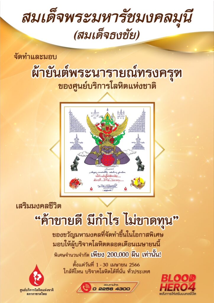 ศูนย์บริการโลหิตแห่งชาติ สภากาชาดไทย ได้รับความกรุณาจากสมเด็จพระมหารัชมงคลมุนี (สมเด็จธงชัย) วัดไตรมิตรวิทยารามวรวิหาร จัดทำผ้ายันต์ พระนารายณ์ทรงครุฑประทับบนพระราหู ศูนย์บริการโลหิตแห่งชาติ รุ่น Limited Edition มีโลโก้ศูนย์บริการโลหิตแห่งชาติ เป็นพิเศษมอบให้เฉพาะผู้บริจาคโลหิตทั่วประเทศ เพื่อเสริมมงคลชีวิต ค้าขายดี มีกำไร ไม่ขาดทุน เป็นของขวัญปีใหม่ไทย ตลอดเดือนเมษายน 2566