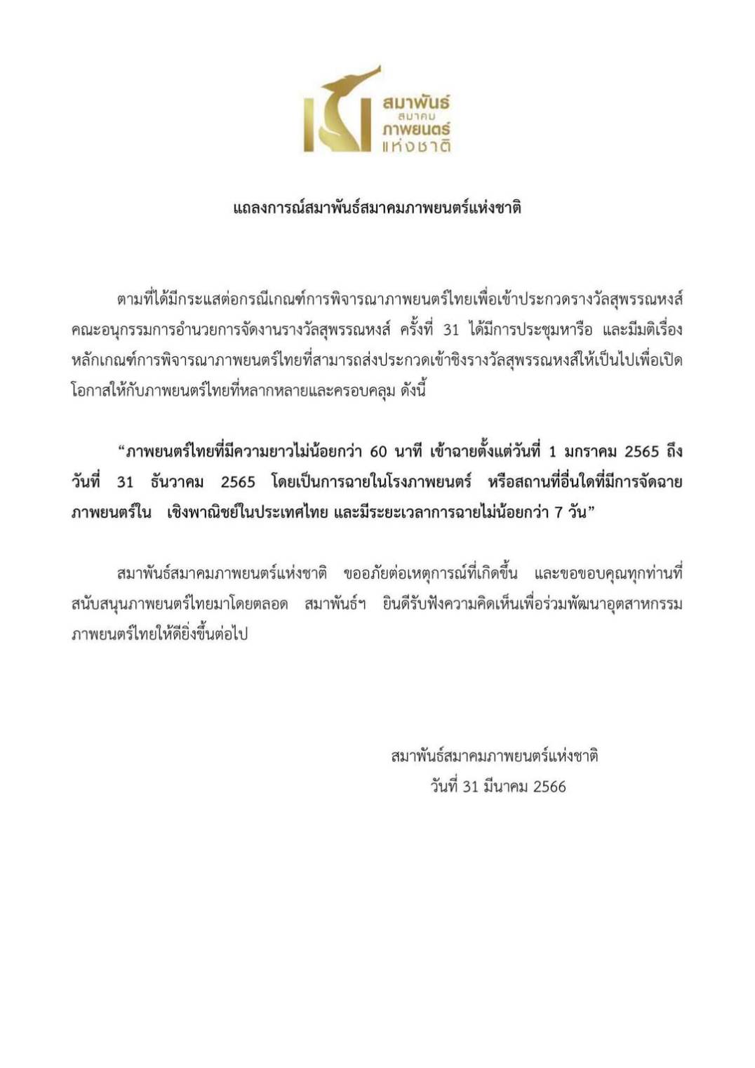 ตามที่ได้มีกระแสต่อกรณีเกณฑ์การพิจารณาภาพยนตร์ไทยเพื่อเข้าประกวดรางวัลสุพรรณหงส์ คณะอนุกรรมการอำนวยการจัดงานรางวัลสุพรรณหงส์ ครั้งที่ 31 ได้มีการประชุมหารือ และมีมติเรื่องหลักเกณฑ์การพิจารณาภาพยนตร์ไทยที่สามารถส่งประกวดเข้าชิงรางวัลสุพรรณหงส์ให้เป็นไปเพื่อเปิดโอกาสให้กับภาพยนตร์ไทยที่หลากหลายและครอบคลุม ดังนี้