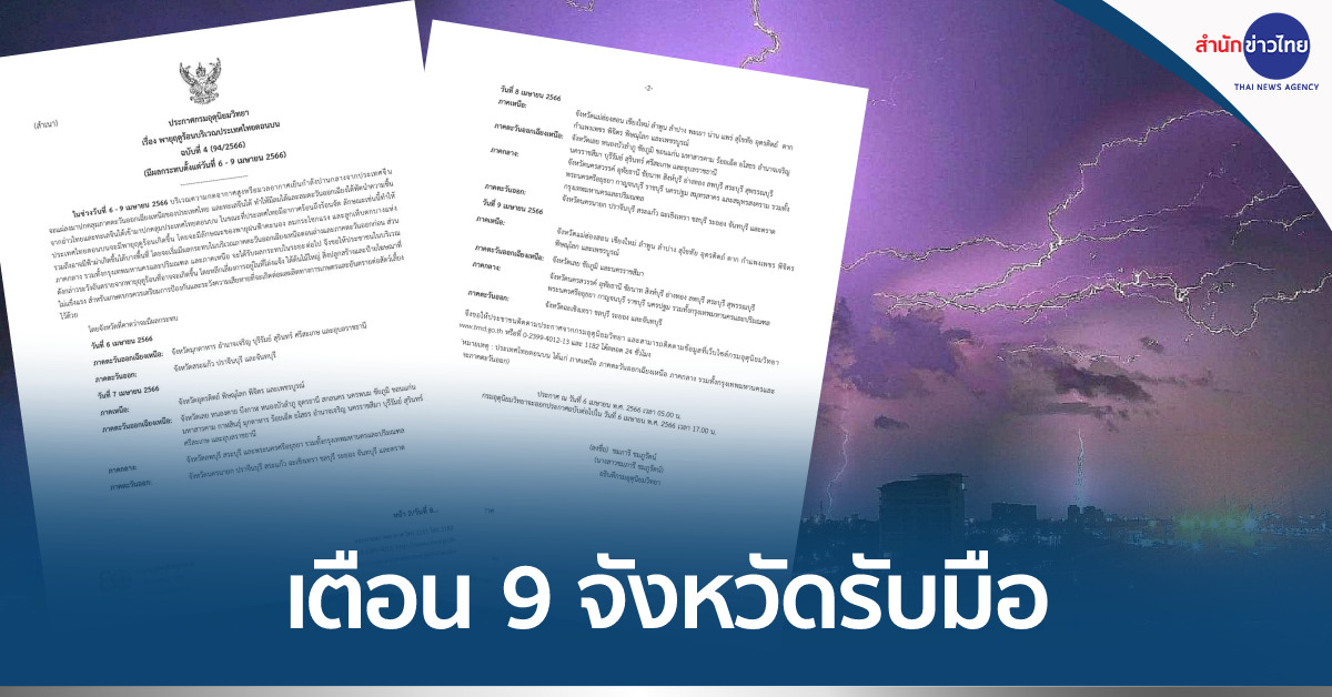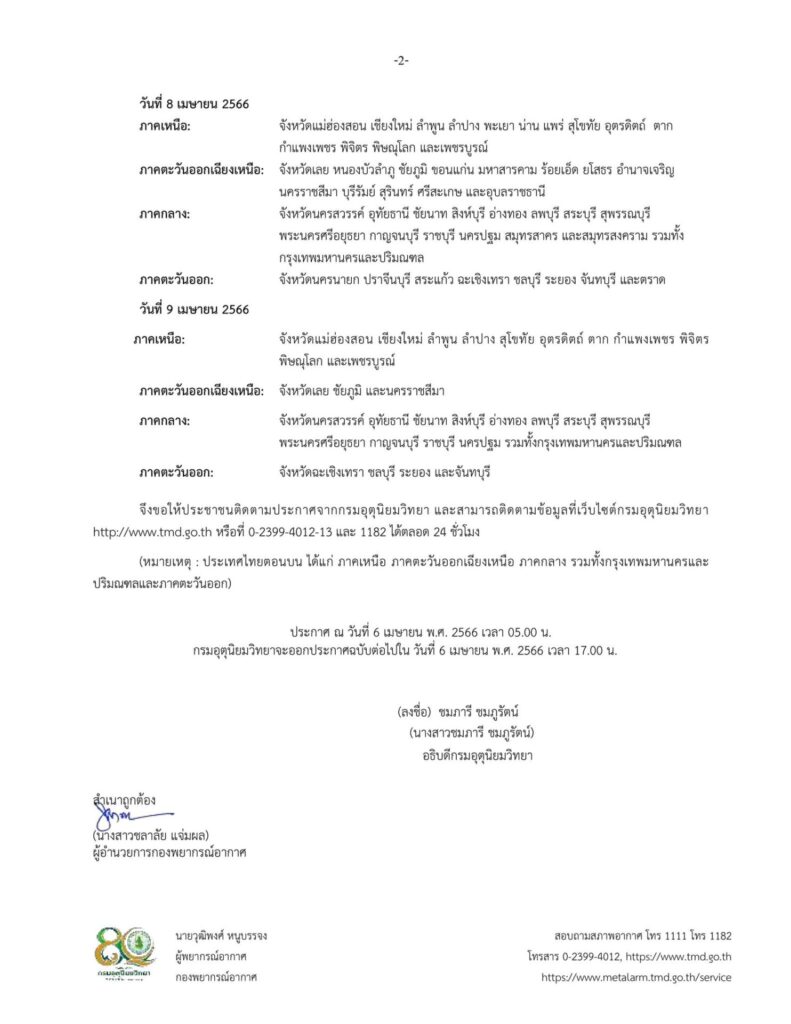 ประกาศกรมอุตุนิยมวิทยา เรื่อง พายุฤดูร้อนบริเวณประเทศไทยตอนบน ฉบับที่ 4 (94/2566) มีผลกระทบตั้งแต่วันที่ 6 – 9 เมษายน 2566