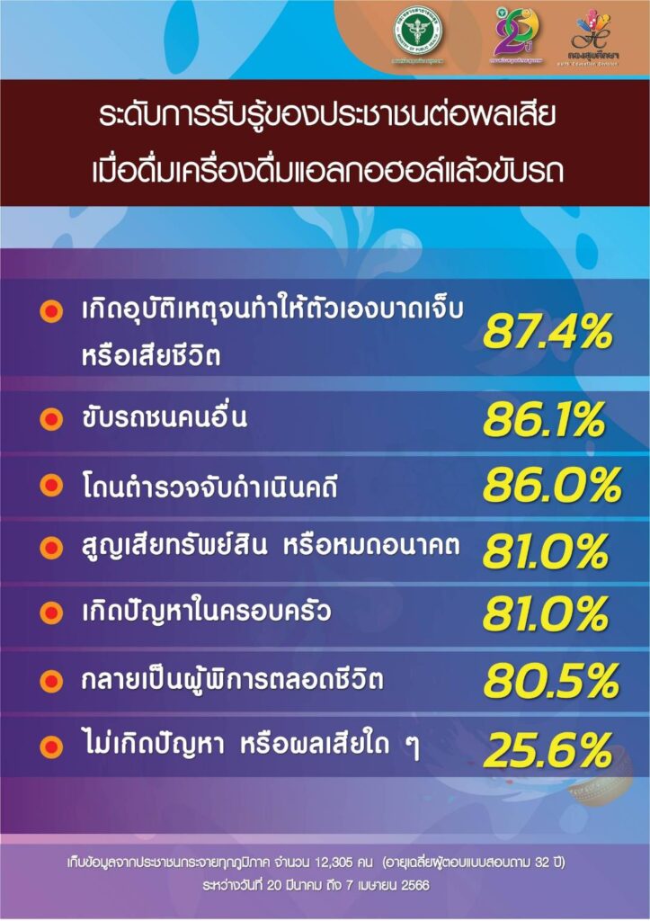 สำหรับประเด็นการรับรู้ผลเสียเมื่อดื่มแอลกอฮอล์แล้วขับรถ พบว่ากลุ่มตัวอย่างรับรู้ว่าการดื่มแล้วขับทำให้เกิดอุบัติเหตุจนทำให้ตัวเองบาดเจ็บหรือเสียชีวิต ร้อยละ 87.4 รองลงมารับรู้ว่าการดื่มแล้วขับทำให้ขับรถชนคนอื่นได้ ร้อยละ 86.1 และรับรู้ว่าดื่มแล้วขับทำให้โดนตำรวจจับดำเนินคดีได้ ร้อยละ 86 แนะสงกรานต์นี้ดื่มไม่ขับ สังสรรค์แบบไร้แอลกอฮอล์