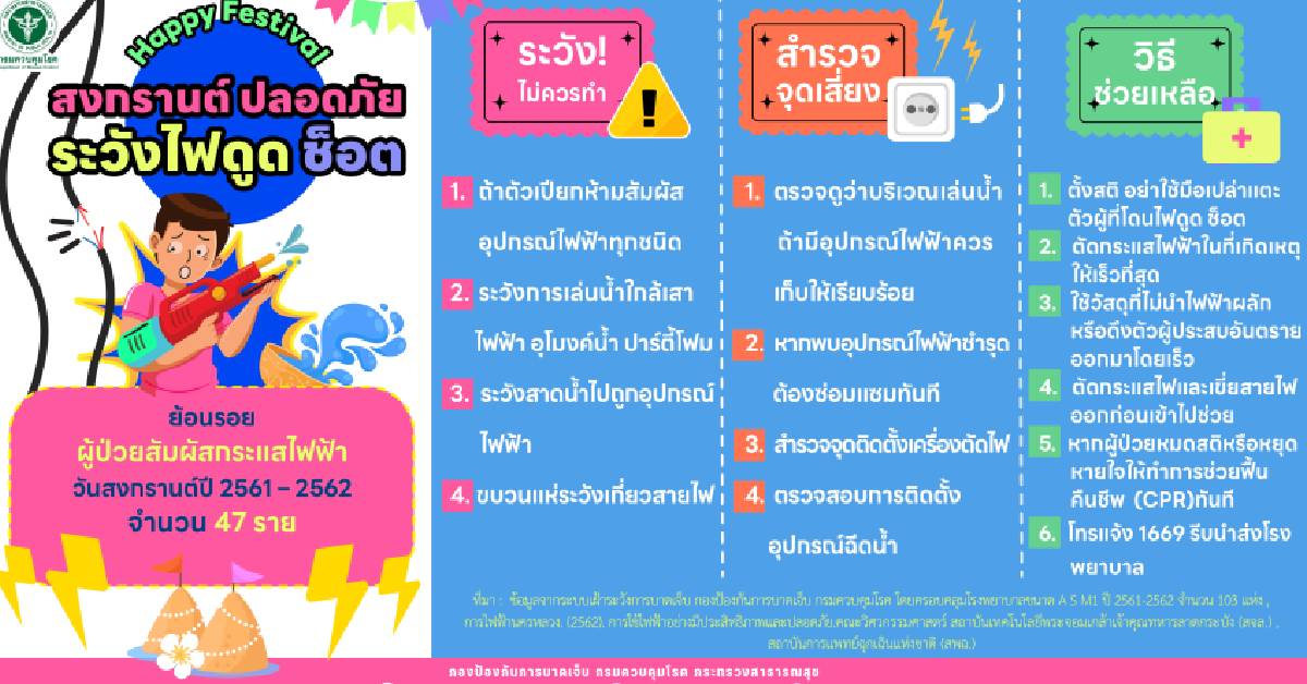 นพ.ธเรศ กรัษนัยรวิวงค์ อธิบดีกรมควบคุมโรค เผยสถิติประเทศไทย ปี 2561-2562 ของกองป้องกันการบาดเจ็บ กรมควบคุมโรค พบจำนวนผู้ป่วยจากการสัมผัสกระแสไฟฟ้าช่วงวันสงกรานต์ และเข้ารับการรักษาในโรงพยาบาล 47 ราย สาเหตุน้ำกระเด็นไปถูกปลั๊กไฟ สายไฟ ทำให้กระแสไฟฟ้ารั่วและไฟฟ้าช็อต ร่างกายเปียกทำให้กระแสไฟสามารถไหลผ่านร่างกายได้ง่าย สายไฟหรืออุปกรณ์ชำรุด และไม่มีระบบกันน้ำซึ่งมีโอกาสเกิดไฟรั่วได้