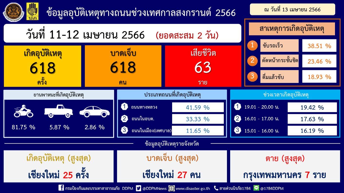 วันนี้ (13 เม.ย. 66) เวลา 10.30 น. ที่กรมป้องกันและบรรเทาสาธารณภัย ศูนย์อำนวยการป้องกันและลดอุบัติเหตุทางถนนช่วงเทศกาลสงกรานต์ พ.ศ.2566 สรุปสถิติอุบัติเหตุทางถนนประจำวันที่ 12 เมษายน 2566 เกิดอุบัติเหตุ 339 ครั้ง ผู้เสียชีวิต 36 ราย ผู้บาดเจ็บ 330 คน สถิติอุบัติเหตุสะสม 2 วัน (11-12 เมษายน 2566) เกิดอุบัติเหตุรวม 618 ครั้ง ผู้เสียชีวิต 63 ราย ผู้บาดเจ็บ 618 คน โดยการขับรถเร็วและดื่มแล้วขับยังคงเป็นสาเหตุที่ทำให้เกิดอุบัติเหตุสูงสุด เน้นย้ำจังหวัดเพิ่มความเข้มข้นกวดขันการขับรถเร็วและการไม่ใช้อุปกรณ์นิรภัย ซึ่งเป็นพฤติกรรมเสี่ยงหลักที่ทำให้เกิดอุบัติเหตุและเสียชีวิต พร้อมประสานจังหวัดใช้กลไกในระดับพื้นที่เข้มข้นการปฏิบัติงานของด่านชุมชน คุมเข้มการดื่มแล้วขับ ขับรถเร็ว และไม่ใช้อุปกรณ์นิรภัย โดยเฉพาะรถจักรยานยนต์ รวมถึงดูแลการเล่นน้ำสงกรานต์อย่างปลอดภัย