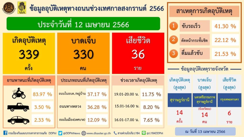 นายบุญธรรม เลิศสุขีเกษม อธิบดีกรมป้องกันและบรรเทาสาธารณภัย (ปภ.) เลขานุการศูนย์อำนวยการความปลอดภัยทางถนน (ศปถ.) ในฐานะประธานการประชุมคณะอนุกรรมการเฉพาะกิจศูนย์อำนวยการป้องกันและลดอุบัติเหตุทางถนนตลอดทั้งปี เปิดเผยว่า ศูนย์อำนวยการป้องกันและลดอุบัติเหตุทางถนนช่วงเทศกาลสงกรานต์ พ.ศ.2566 โดยกรมป้องกันและบรรเทาสาธารณภัย และความร่วมมือของหน่วยงานภาคีเครือข่ายได้รวบรวมสถิติอุบัติเหตุทางถนนประจำวันที่ 12 เมษายน 2566 ซึ่งเป็oวันที่สองของการรณรงค์ “ชีวิตวิถีใหม่ ขับขี่อย่างปลอดภัย ไร้อุบัติเหตุ” เกิดอุบัติเหตุ 339 ครั้ง ผู้เสียชีวิต 36 ราย ผู้บาดเจ็บ 330 คน สาเหตุที่ทำให้เกิดอุบัติเหตุสูงสุด ได้แก่ ขับรถเร็วเกินกำหนด ร้อยละ 41.30 ตัดหน้ากระชั้นชิด ร้อยละ 22.12 ยานพาหนะที่เกิดอุบัติเหตุสูงสุด ได้แก่ รถจักรยานยนต์ ร้อยละ 83.97 ส่วนใหญ่เกิดบนถนนใน อบต./หมู่บ้าน ร้อยละ 37.17 ถนนกรมทางหลวง ร้อยละ 36.28 บริเวณจุดเกิดเหตุเป็นทางตรง ร้อยละ 81.42 ช่วงเวลาที่เกิดอุบัติเหตุสูงสุด ได้แก่ ช่วงเวลา 19.01 – 20.00 น. ร้อยละ 11.75 ผู้บาดเจ็บและเสียชีวิตอยู่ในช่วงอายุ 20 – 29 ปี ร้อยละ 19.13 โดยจังหวัดที่เกิดอุบัติเหตุสูงสุด ได้แก่ สุราษฎร์ธานี (14 ครั้ง) จังหวัดที่มีผู้บาดเจ็บสูงสุด ได้แก่ นครศรีธรรมราช และสุราษฎร์ธานี (จังหวัดละ 14 คน) จังหวัดที่มีผู้เสียชีวิตสูงสุด ได้แก่ กรุงเทพมหานคร (6 ราย) ทั้งนี้ เจ้าหน้าที่ได้จัดตั้งจุดตรวจหลัก 1,874 จุด เจ้าหน้าที่ปฏิบัติงาน 54,594 คน เรียกตรวจยานพาหนะ 338,612 คัน มีผู้ถูกดำเนินคดี รวม 56,566 ราย มีความผิดฐานไม่มีใบขับขี่ 17,371 ราย ไม่สวมหมวกนิรภัย 16,968 ราย สรุปสถิติอุบัติเหตุทางถนนสะสม 2 วัน (วันที่ 11 – 12 เมษายน 2566) เกิดอุบัติเหตุรวม 618 ครั้ง ผู้เสียชีวิต 63 ราย ผู้บาดเจ็บ 618 คน โดยจังหวัดที่เกิดอุบัติเหตุสะสมสูงสุด ได้แก่ เชียงใหม่ (25 ครั้ง) จังหวัดที่มีผู้เสียชีวิตสะสมสูงสุด ได้แก่ กรุงเทพมหานคร (7 ราย) และจังหวัดที่มีผู้บาดเจ็บสะสมสูงสุด ได้แก่ เชียงใหม่ (27 คน)