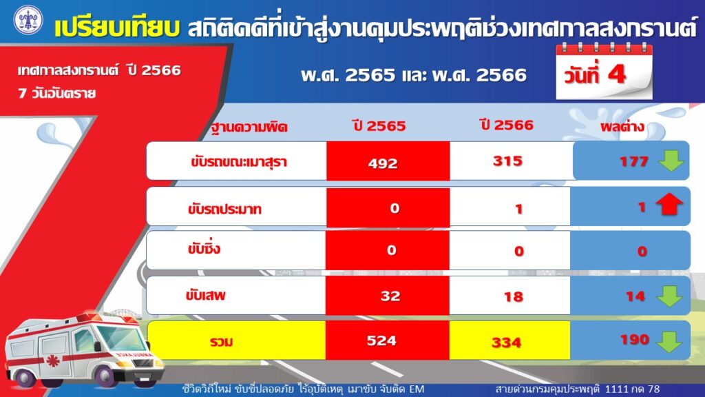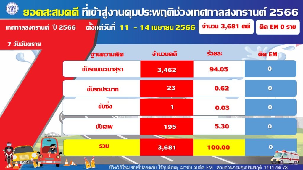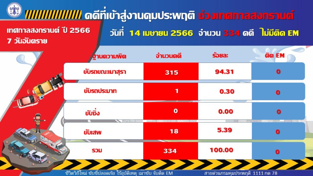 อธิบดีกรมคุมประพฤติ กล่าวเพิ่มเติมว่า ในวันที่ 14 เมษายน 2566 มีสถิติคดีที่ศาลสั่งคุมความประพฤติ รวมทั้งสิ้น 334 คดี จำแนกเป็น คดีขับรถขณะเมาสุรา 315 คดี คดีขับรถประมาท 1 คดี และคดีขับเสพ 18 คดี สำหรับยอดรวมสะสม 4 วัน ของ 7 วันอันตราย มีจำนวน 3,681 คดี จำแนกเป็น คดีขับรถขณะเมาสุรา 3,462 คดี คิดเป็นร้อยละ 94.05 คดีขับรถประมาท 23 คดี คิดเป็นร้อยละ 0.62 คดีขับซิ่ง 1 คดี คิดเป็นร้อยละ 0.03 คดีขับเสพ 195 คดี คิดเป็นร้อยละ 5.3 โดยกรุงเทพมหานคร มีคดีเมาขับสูงสุดอันดับหนึ่ง 233 คดี รองลงมา นนทบุรี 204 คดี และร้อยเอ็ด 164 คดี ทั้งนี้ เมื่อเปรียบเทียบสถิติคดีเข้าสู่คุมประพฤติในวันที่ 4 ของ7 วันอันตรายปี 2565 พบว่า คดีขับรถขณะเมาสุรา จำนวน 492 คดี และ ปี 2566 จำนวน 315 คดี ลดลง 177 คดี คิดเป็นร้อยละ 35.97