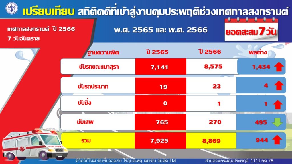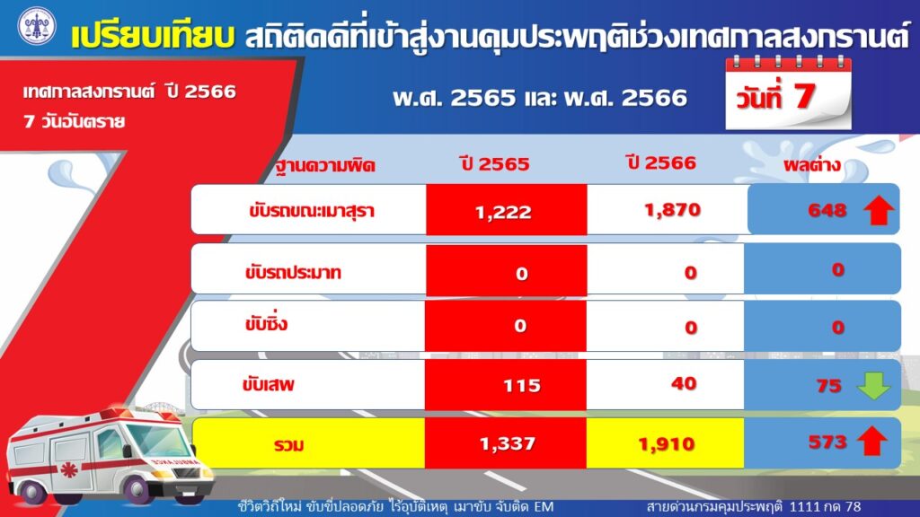 นายวีระกิตติ์ หาญปริพรรณ์ อธิบดีกรมคุมประพฤติ เปิดเผยว่า วันสุดท้ายของการคุมเข้ม 7 วันอันตรายสงกรานต์ 2566 (17 เมษายน 2566) สถิติคดีที่ศาลสั่งคุมความประพฤติมีจำนวนทั้งสิ้น 1,910 คดี จำแนกเป็น คดีขับรถขณะเมาสุรา 1,870 คดี คิดเป็นร้อยละ 97.9 และคดีขับเสพ 40 คดี คิดเป็นร้อยละ 2.1 สำหรับยอดสะสม 7 วัน (วันที่ 11-17 เมษายน 2566) มีจำนวนทั้งสิ้น 8,869 คดี จำแนกเป็น คดีขับรถขณะเมาสุรา 8,575 คดี คิดเป็นร้อยละ 96.69 คดีขับรถประมาท 23 คดี คิดเป็นร้อยละ 0.26 คดีขับซิ่ง 1 คดี คิดเป็นร้อยละ 0.01 และคดีขับเสพ 270 คดี คิดเป็นร้อยละ 3.04 จังหวัดที่มีคดีขับรถในขณะเมาสุราสูงสุด 3 อันดับ ได้แก่ กรุงเทพมหานคร จำนวน 530 คดี รองลงมาร้อยเอ็ด จำนวน 473 คดี และอันดับสาม เชียงใหม่ จำนวน 458 คดี เมื่อเปรียบเทียบสถิติคดีขับรถขณะเมาสุราสะสมทั้ง 7 วันที่เข้าสู่ระบบงานคุมประพฤติในช่วงเทศกาลสงกรานต์ พ.ศ. 2565 มีจำนวน 7,141 คดี กับ ปี พ.ศ. 2566 จำนวน 8,575 คดี พบว่า คดีขับรถขณะเมาสุรา มีจำนวนเพิ่มขึ้น 1,434 คดี คิดเป็นร้อยละ 20.08
