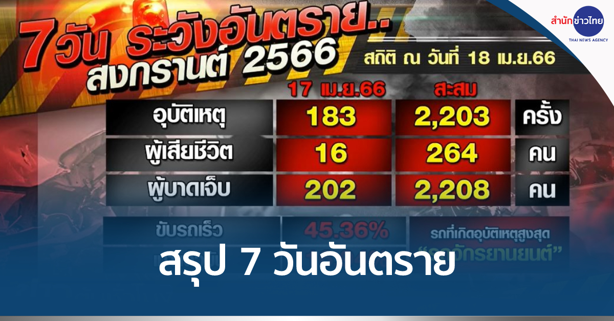 กรุงเทพฯ 18 เม.ย. – ศปถ.รายงานสรุป 7 วันอันตราย ช่วงเทศกาลสงกรานต์ เกิดอุบัติเหตุรวม 2,203 ครั้ง ผู้เสียชีวิต 264 คน ผู้บาดเจ็บ 2,208 คน