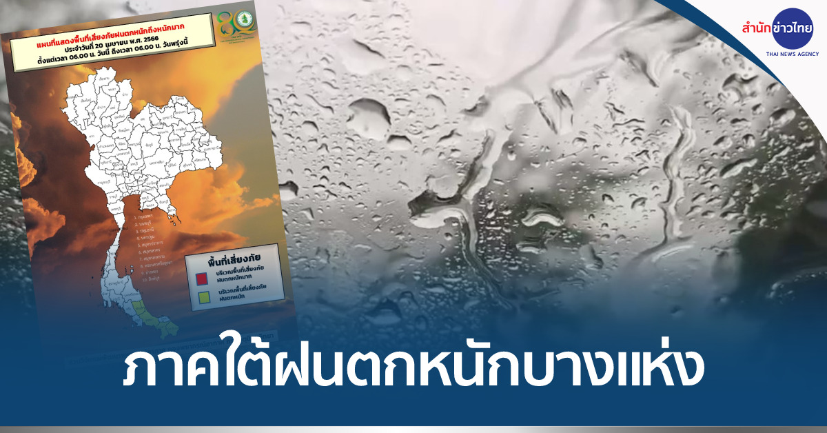 ภาคใต้ (ฝั่งตะวันตก) : อากาศร้อนในตอนกลางวัน โดยมีฝนฟ้าคะนอง ร้อยละ 20 ของพื้นที่ ส่วนมากบริเวณจังหวัดกระบี่ ตรัง และสตูล อุณหภูมิต่ำสุด 25-28 องศาเซลเซียส อุณหภูมิสูงสุด 33-36 องศาเซลเซียส ลมตะวันตกเฉียงเหนือ ความเร็ว 15-30 กม./ชม. ทะเลมีคลื่นสูงประมาณ 1 เมตร บริเวณที่มีฝนฟ้าคะนองคลื่นสูงมากกว่า 1 เมตร.-สำนักข่าวไทย