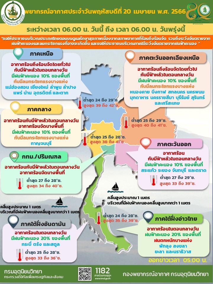 กรมอุตุนิยมวิทยา พยากรณ์อากาศ 24 ชั่วโมงข้างหน้า ประเทศไทยมีอากาศร้อนโดยทั่วไปกับมีฟ้าหลัวในตอนกลางวัน และมีอากาศร้อนจัดบางพื้นที่ ทั้งนี้เนื่องจากความกดอากาศต่ำเนื่องจากความร้อนปกคลุมประเทศไทยตอนบน ในขณะที่ลมตะวันตกเฉียงใต้และลมใต้พัดปกคลุมประเทศไทยตอนบน ลักษณะเช่นนี้ทำให้ประเทศไทยตอนบนยังคงมีฝนฟ้าคะนองเกิดขึ้นได้บางพื้นที่ ขอให้ประชาชนบริเวณประเทศไทยตอนบนดูแลรักษาสุขภาพเนื่องจากสภาพอากาศที่ร้อนถึงร้อนจัด รวมถึงระวังอันตรายจากฝนฟ้าคะนองและลมกระโชกแรงที่อาจจะเกิดขึ้น สำหรับลมตะวันตกเฉียงเหนือและลมตะวันตกเฉียงใต้พัดปกคลุมทะเลอันดามัน ภาคใต้ และอ่าวไทย ทำให้ภาคใต้มีฝนฟ้าคะนองเกิดขึ้นและมีฝนตกหนักบางแห่ง ขอให้ประชาชนในบริเวณดังกล่าวระวังอันตรายจากฝนฟ้าคะนอง