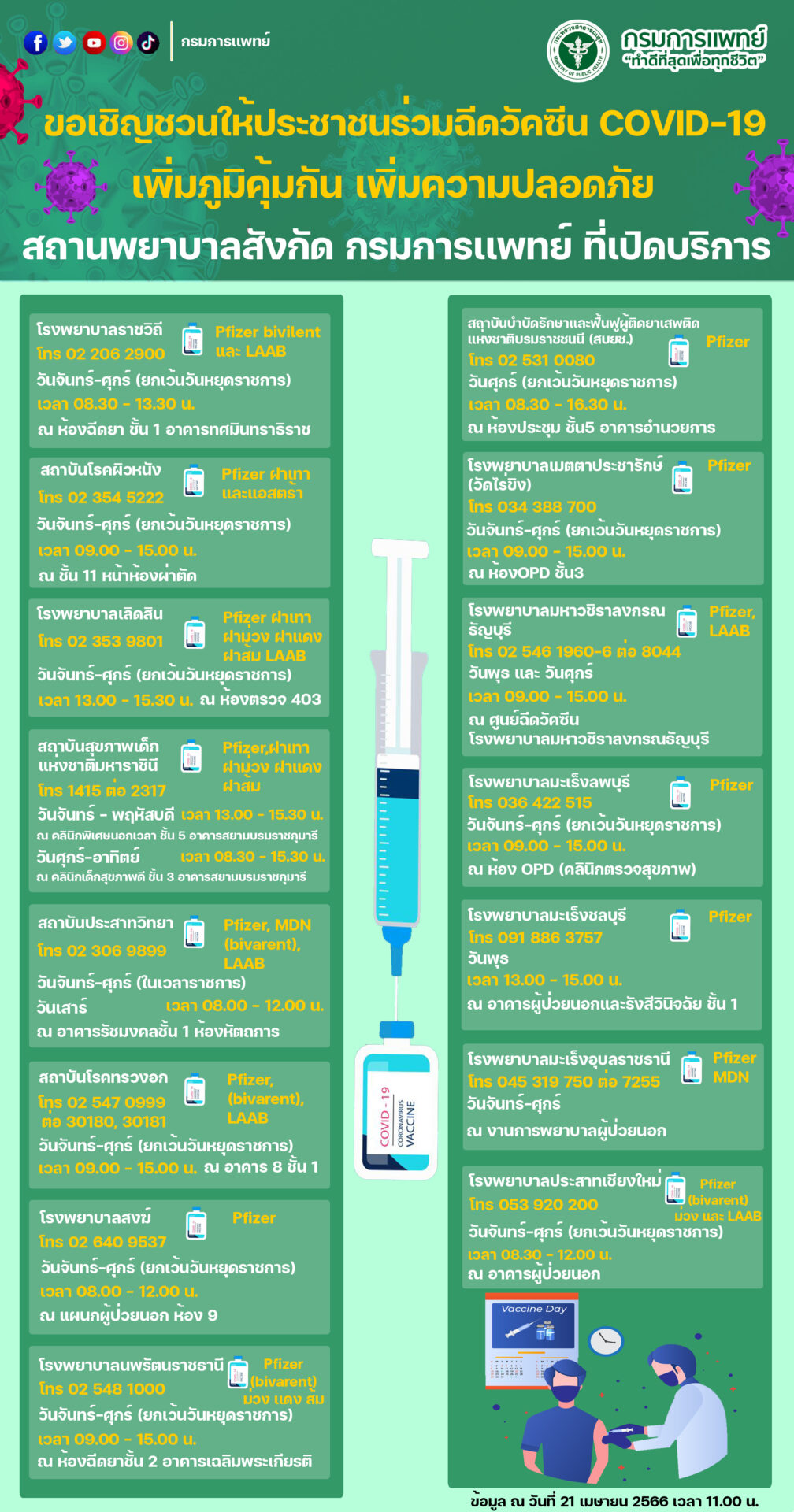 จากแนวโน้มการแพร่ระบาดของโควิดสายพันธุ์ใหม่ หลังวันหยุดยาวเทศกาลสงกรานต์ที่ผ่านมา กรมการแพทย์ กระทรวงสาธารณสุข มีการสั่งการให้หน่วยงานในสังกัดเปิดจุดฉีดวัคซีน เพื่อให้บริการประชาชนได้อย่างทั่วถึง ทั้งในกรุงเทพมหานครและต่างจังหวัด โดยขอเน้นย้ำว่า การฉีดวัคซีนป้องกันโรคโควิด ยังคงมีความสำคัญ โดยเฉพาะกลุ่มเสี่ยง 608 หรือหลังจากได้รับวัคฉีดเข็มสุดท้ายอย่างน้อย 3 เดือน ป้องกันการเจ็บป่วยรุนแรงและการเสียชีวิต โดยประชาชนสามารถเข้ารับบริการวัคซีนโควิด-19 ได้ หากมีข้อสงสัยสามารถโทรสอบถามได้ที่สถานพยาบาลในสังกัดกรมการแพทย์ทุกแห่งทั่วประเทศ
