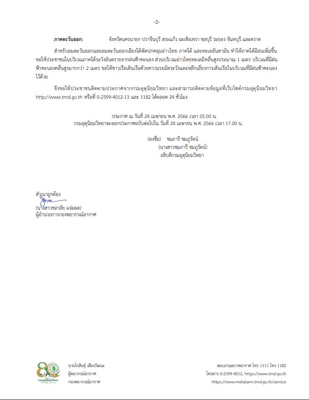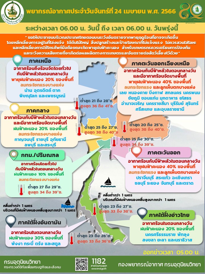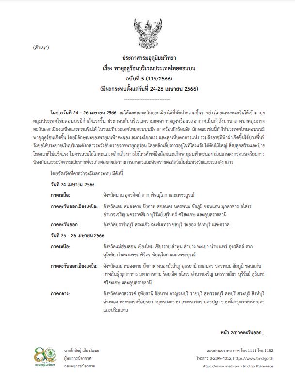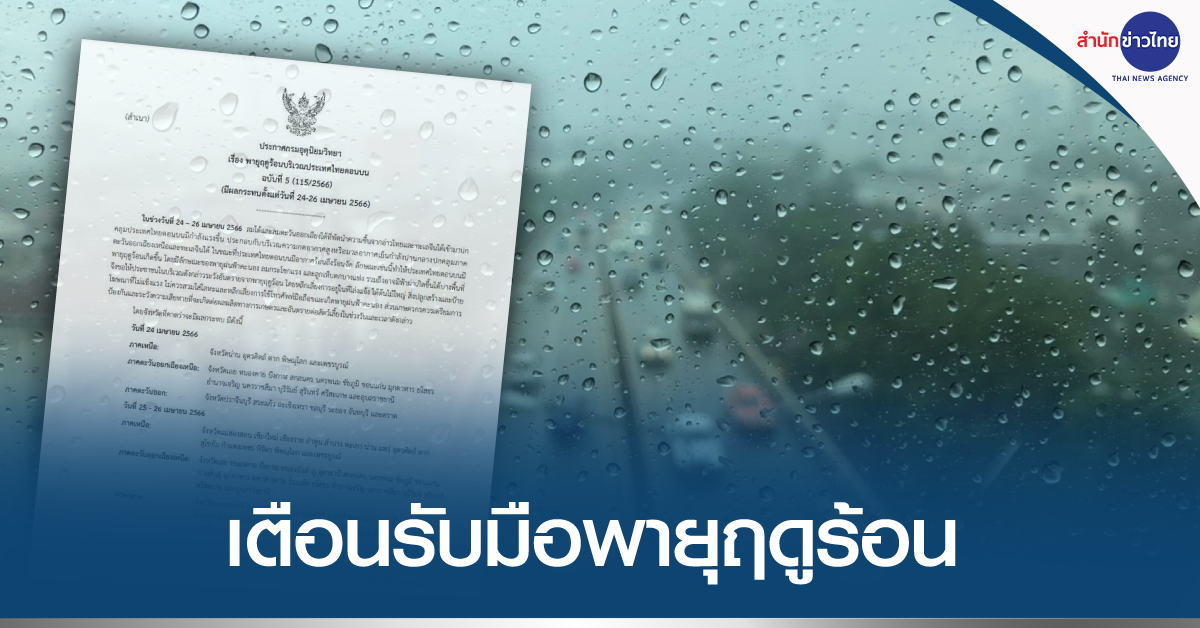 กรมอุตุนิยมวิทยา ออกประกาศ เรื่อง พายุฤดูร้อนบริเวณประเทศไทยตอนบน ฉบับที่ 5 (มีผลกระทบตั้งแต่วันที่ 24-26 เมษายน 2566) ระบุว่า ในช่วงวันที่ 24-26 เมษายน 2566 ลมใต้และลมตะวันออกเฉียงใต้ที่พัดนำความชื้นจากอ่าวไทยและทะเลจีนใต้เข้ามาปกคลุมประเทศไทยตอนบนมีกำลังแรงขึ้น ประกอบกับบริเวณความกดอากาศสูงหรือมวลอากาศเย็นกำลังปานกลางปกคลุมภาคตะวันออกเฉียงเหนือและทะเลจีนใต้ ในขณะที่ประเทศไทยตอนบนมีอากาศร้อนถึงร้อนจัด ลักษณะเช่นนี้ทำให้ประเทศไทยตอนบนมีพายุฤดูร้อนเกิดขึ้น โดยมีลักษณะของพายุฝนฟ้าคะนอง ลมกระโชกแรง และลูกเห็บตกบางแห่ง รวมถึงอาจมีฟ้าผ่าเกิดขึ้นได้บางพื้นที่ จึงขอให้ประชาชนในบริเวณดังกล่าวระวังอันตรายจากพายุฤดูร้อน โดยหลีกเลี่ยงการอยู่ในที่โล่งแจ้ง ใต้ต้นไม้ใหญ่ สิ่งปลูกสร้างและป้ายโฆษณาที่ไม่แข็งแรง ไม่ควรสวมใส่โลหะ และหลีกเลี่ยงการใช้โทรศัพท์มือถือขณะเกิดพายุฝนฟ้าคะนอง ส่วนเกษตรกรควรเตรียมการป้องกันและระวังความเสียหายที่จะเกิดต่อผลผลิตทางการเกษตรและอันตรายต่อสัตว์เลี้ยงในช่วงวันและเวลาดังกล่าว