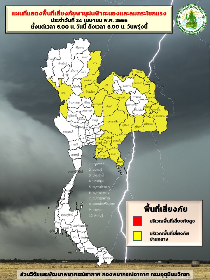 กรมอุตุฯ 24 เม.ย. – กรมอุตุฯ ประกาศฉบับที่ 5 เตือน 58 จังหวัด รับมือพายุฤดูร้อน โดยจะมีฝนฟ้าคะนอง ลมกระโชกแรง ลูกเห็บตก และฟ้าผ่าบางพื้นที่ ช่วงวันที่ 24-26 เม.ย.นี้