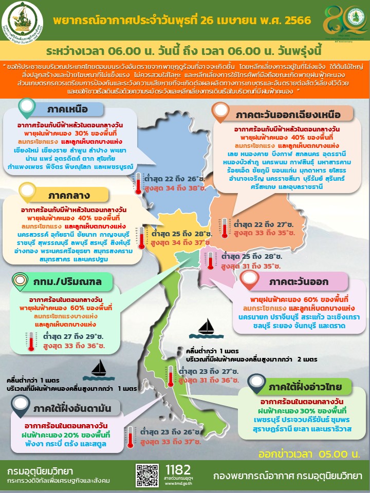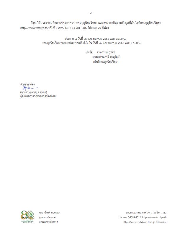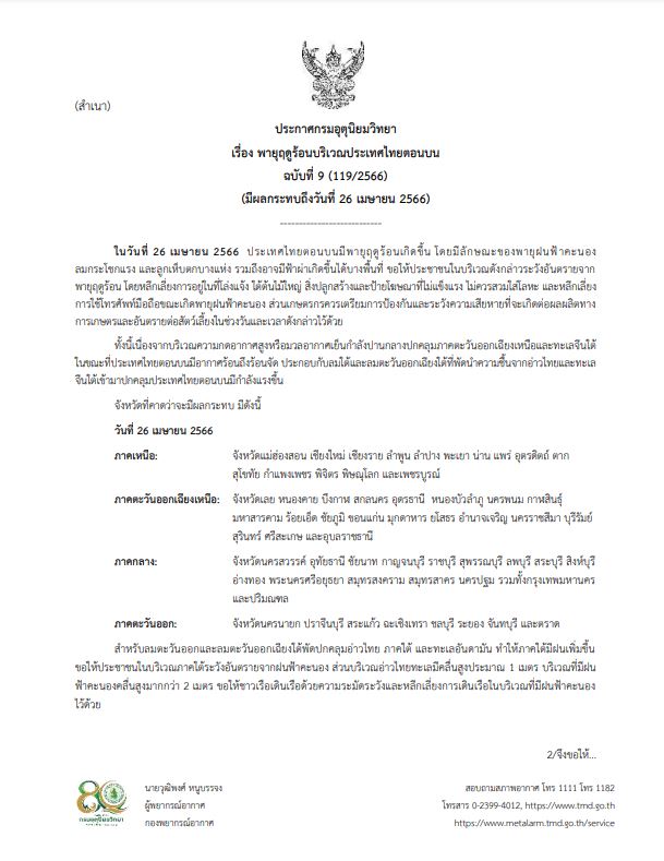 กรมอุตุนิยมวิทยา ออกประกาศ เรื่อง พายุฤดูร้อนบริเวณประเทศไทยตอนบน ฉบับที่ 9 (มีผลกระทบถึงวันที่ 26 เมษายน 2566) ระบุว่า ในวันที่ 26 เมษายน 2566 ประเทศไทยตอนบนมีพายุฤดูร้อนเกิดขึ้น โดยมีลักษณะของพายุฝนฟ้าคะนอง ลมกระโชกแรง และลูกเห็บตกบางแห่ง รวมถึงอาจมีฟ้าผ่าเกิดขึ้นได้บางพื้นที่ ขอให้ประชาชนในบริเวณดังกล่าวระวังอันตรายจากพายุฤดูร้อน โดยหลีกเลี่ยงการอยู่ในที่โล่งแจ้ง ใต้ต้นไม้ใหญ่ สิ่งปลูกสร้างและป้ายโฆษณาที่ไม่แข็งแรง ไม่ควรสวมใส่โลหะ และหลีกเลี่ยงการใช้โทรศัพท์มือถือขณะเกิดพายุฝนฟ้าคะนอง ส่วนเกษตรกรควรเตรียมการป้องกันและระวังความเสียหายที่จะเกิดต่อผลผลิตทางการเกษตรและอันตรายต่อสัตว์เลี้ยงในช่วงวันและเวลาดังกล่าวไว้ด้วย