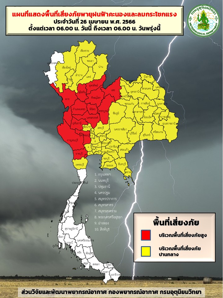 กรมอุตุฯ 26 เม.ย. – กรมอุตุฯ ประกาศฉบับที่ 9 เตือนพายุฤดูร้อนบริเวณไทยตอนบน 58 จังหวัดได้รับผลกระทบ โดยมีฝนฟ้าคะนอง ลมกระโชกแรง ลูกเห็บตก และฟ้าผ่าบางพื้นที่