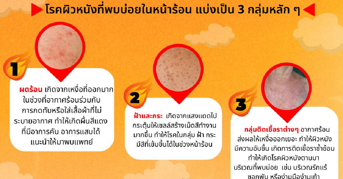 นายแพทย์มานัส โพธาภรณ์ รองอธิบดีกรมการแพทย์ กล่าวถึงโรคผิวหนังที่พบบ่อยในหน้าร้อน แบ่งเป็น 3 กลุ่มหลักๆ คือ กลุ่มที่ 1 ผดร้อน เกิดจากเหงื่อที่ออกมากในช่วงที่อากาศร้อน ร่วมกับการกดทับหรือใส่เสื้อผ้าที่ไม่ระบายอากาศ ทำให้เกิดผื่นสีแดงที่มีอาการคัน อาการแสบได้ แนะนำให้พบแพทย์