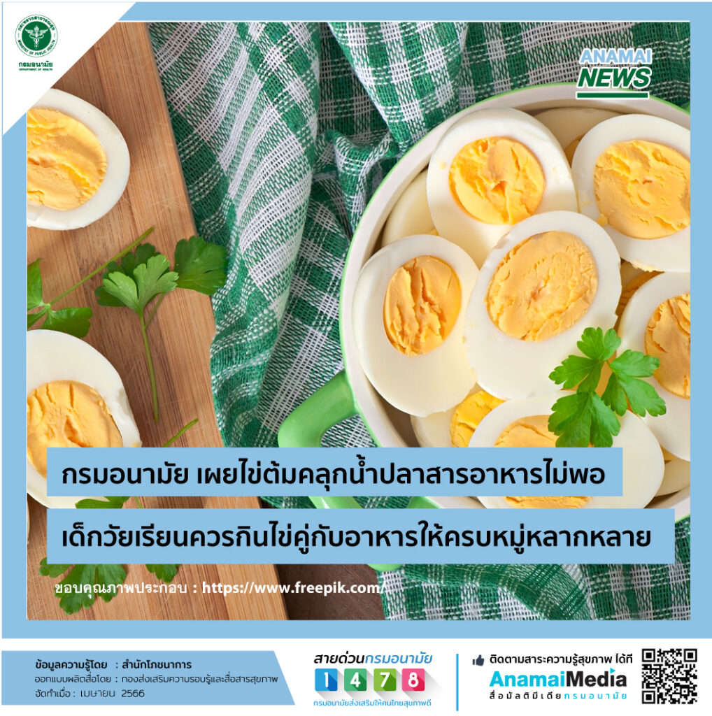 กทม. 27 เม.ย.- กรมอนามัย กระทรวงสาธารณสุข เผย ไข่เป็นอาหารที่มีคุณค่าทางโภชนาการ มีโปรตีนคุณภาพดีและวิตามิน แร่ธาตุ เหมาะกับคนทุกกลุ่มวัย แต่ไม่ควรบริโภคไข่อย่างเดียว โดยเฉพาะเด็กวัยเรียนควรกินอาหารให้ได้สัดส่วนตามธงโภชนาการ ครบกลุ่มหลากหลายเพื่อให้ได้สารอาหารครบถ้วน เพียงพอ