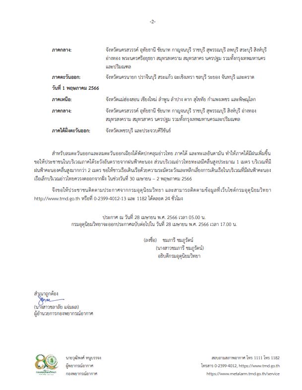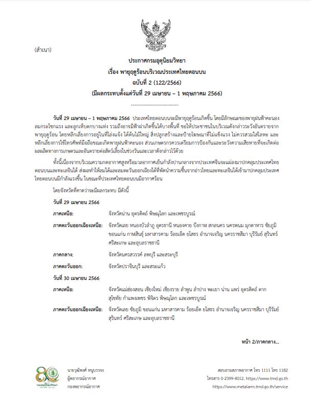 กรมอุตุนิยมวิทยา ออกประกาศ เรื่อง พายุฤดูร้อนบริเวณประเทศไทยตอนบน ฉบับที่ 2 (มีผลกระทบตั้งแต่วันที่ 29 เมษายน – 1 พฤษภาคม 2566) ระบุว่า วันที่ 29 เมษายน – 1 พฤษภาคม 2566 ประเทศไทยตอนบนจะมีพายุฤดูร้อนเกิดขึ้น โดยมีลักษณะของพายุฝนฟ้าคะนอง ลมกระโชกแรง และลูกเห็บตกบางแห่ง รวมถึงอาจมีฟ้าผ่าเกิดขึ้นได้บางพื้นที่ ขอให้ประชาชนในบริเวณดังกล่าวระวังอันตรายจากพายุฤดูร้อน โดยหลีกเลี่ยงการอยู่ในที่โล่งแจ้ง ใต้ต้นไม้ใหญ่ สิ่งปลูกสร้างและป้ายโฆษณาที่ไม่แข็งแรง ไม่ควรสวมใส่โลหะ และหลีกเลี่ยงการใช้โทรศัพท์มือถือขณะเกิดพายุฝนฟ้าคะนอง ส่วนเกษตรกรควรเตรียมการป้องกันและระวังความเสียหายที่จะเกิดต่อผลผลิตทางการเกษตรและอันตรายต่อสัตว์เลี้ยงในช่วงวันและเวลาดังกล่าวไว้ด้วย